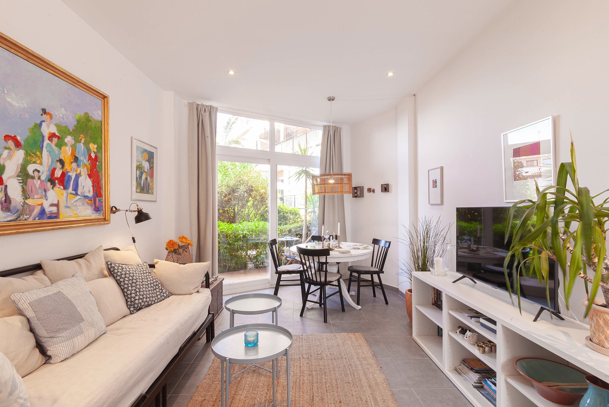 Das Appartement wurde 2017 vollständig renoviert und verfügt über eine Wohnfläche von 51 m² sowie zwei private Terrassen – eine mit einer Größe von 20 m² und herrlicher Morgensonne, die andere mit 11 m² Größe und Nachmittags- und Abendsonne. Die Immobilie bietet ein Schlafzimmer, eine Schlafnische, ein Badezimmer, eine Küche und ein Wohnzimmer mit direktem Zugang zu den Terrassen sowie zum üppigen Gemeinschaftsgarten mit Pool. Küche und Wohnzimmer sind in einem offenen Grundriss gestaltet, der zusammen mit den Terrassen ein wunderbares Innen-Außen-Gefühl schafft. Das Appartement ist komfortabel und gut durchdacht geschnitten und überzeugt mit einer hellen und einladenden Atmosphäre.