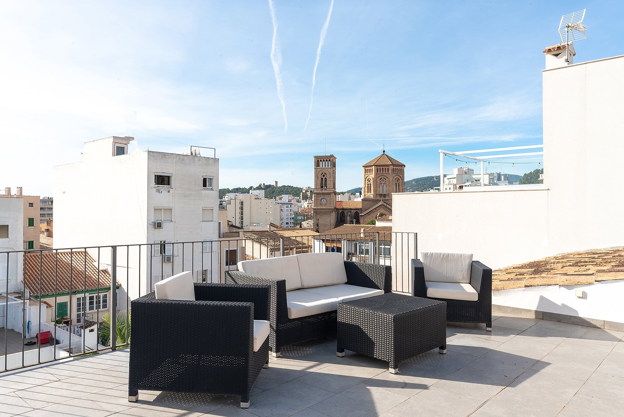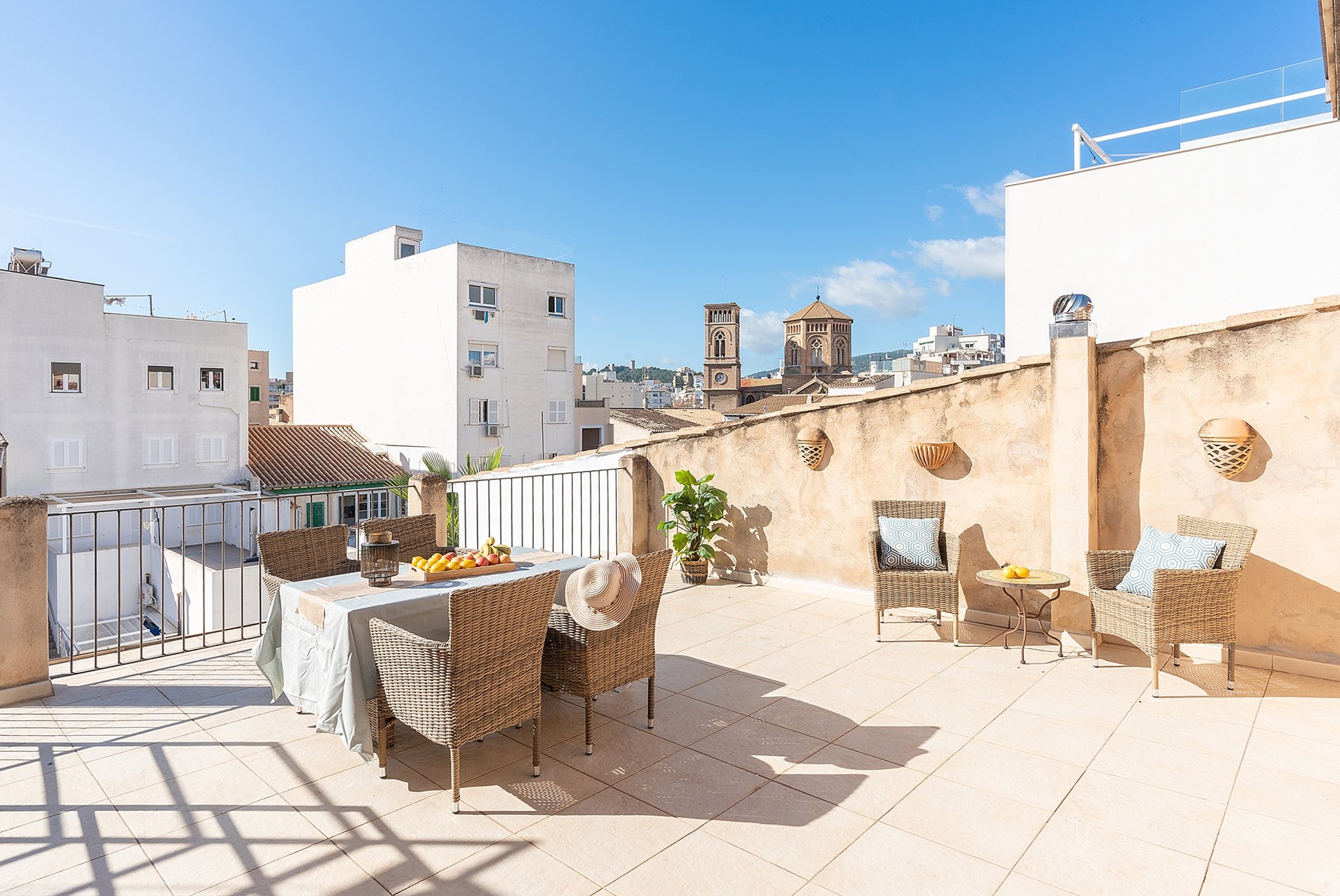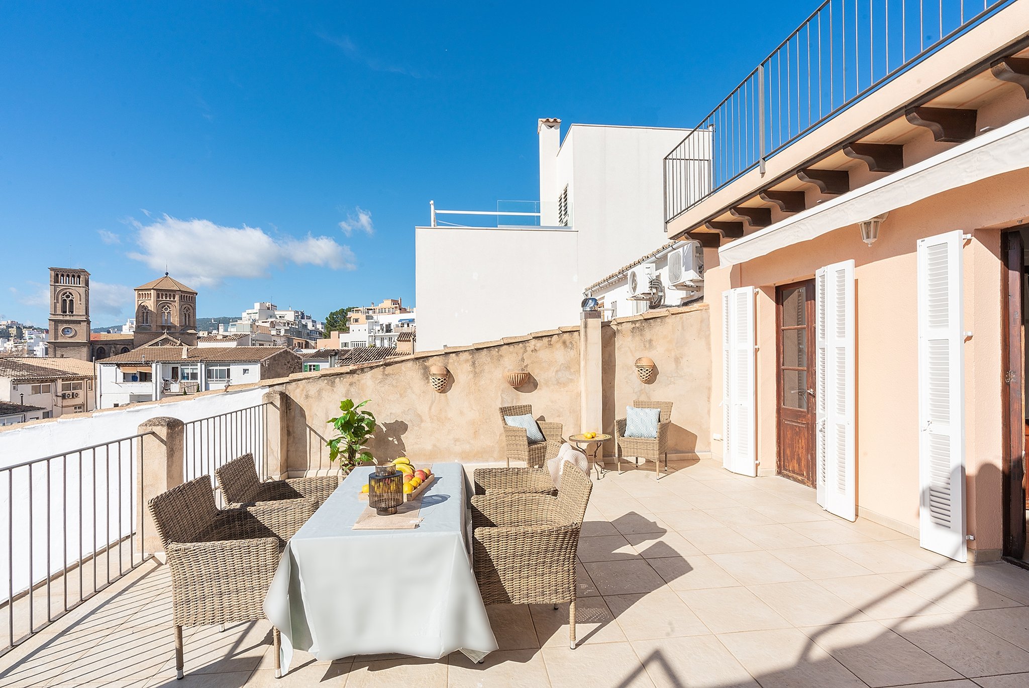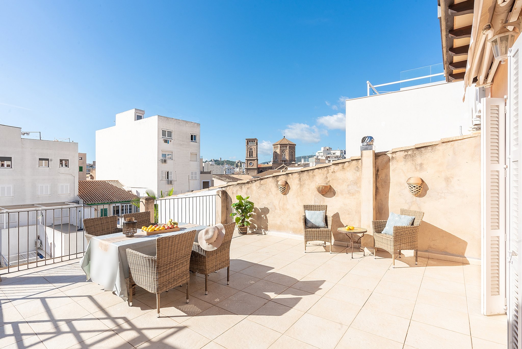 Dieses helle Duplex-Penthouse ist ein einzigartiges Juwel in fantastischer Lage. Die Wohnfläche von ca. 126 m2 verteilt sich auf zwei Ebenen. Die Eingangsebene besteht aus zwei Schlafzimmern, einem Badezimmer, einem Wohnzimmer mit separater Leseecke und einer frischen Siematic-Küche im offenen Raum. Eine schöne Treppe führt hinauf zum Hauptschlafzimmer, das über ein eigenes Badezimmer und Einbauschränke verfügt. Vom Schlafzimmer aus gelangen Sie auf die fantastische untere Terrasse von 35 m2 in Südlage mit Sonnen- und Windschutz. Auf der unteren Terrasse gibt es außerdem einen kombinierten Abstell- und Waschraum. Eine weitere Treppe führt hinauf zu einer oberen privaten Dachterrasse von 33 m2 mit 360-Grad-Blick auf Palma.