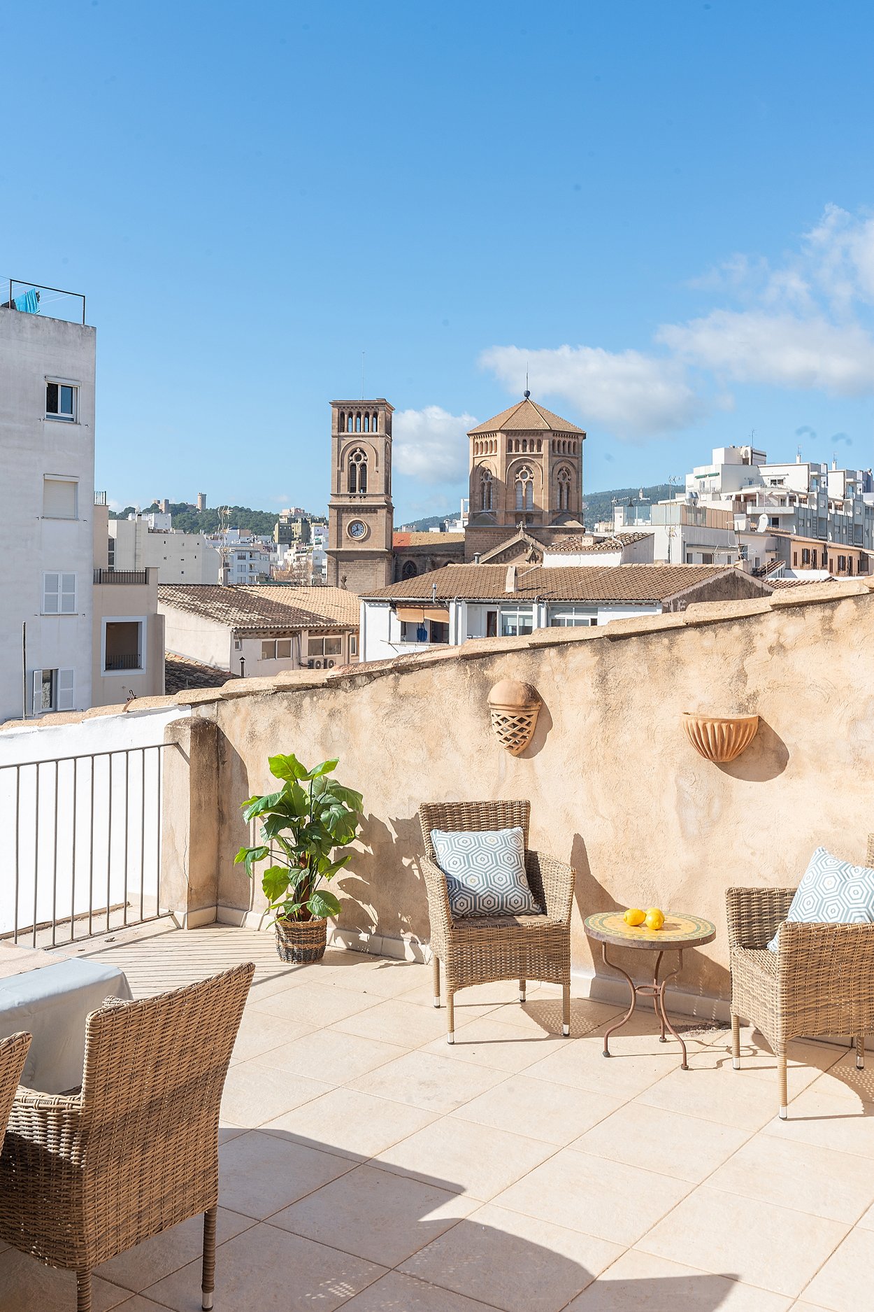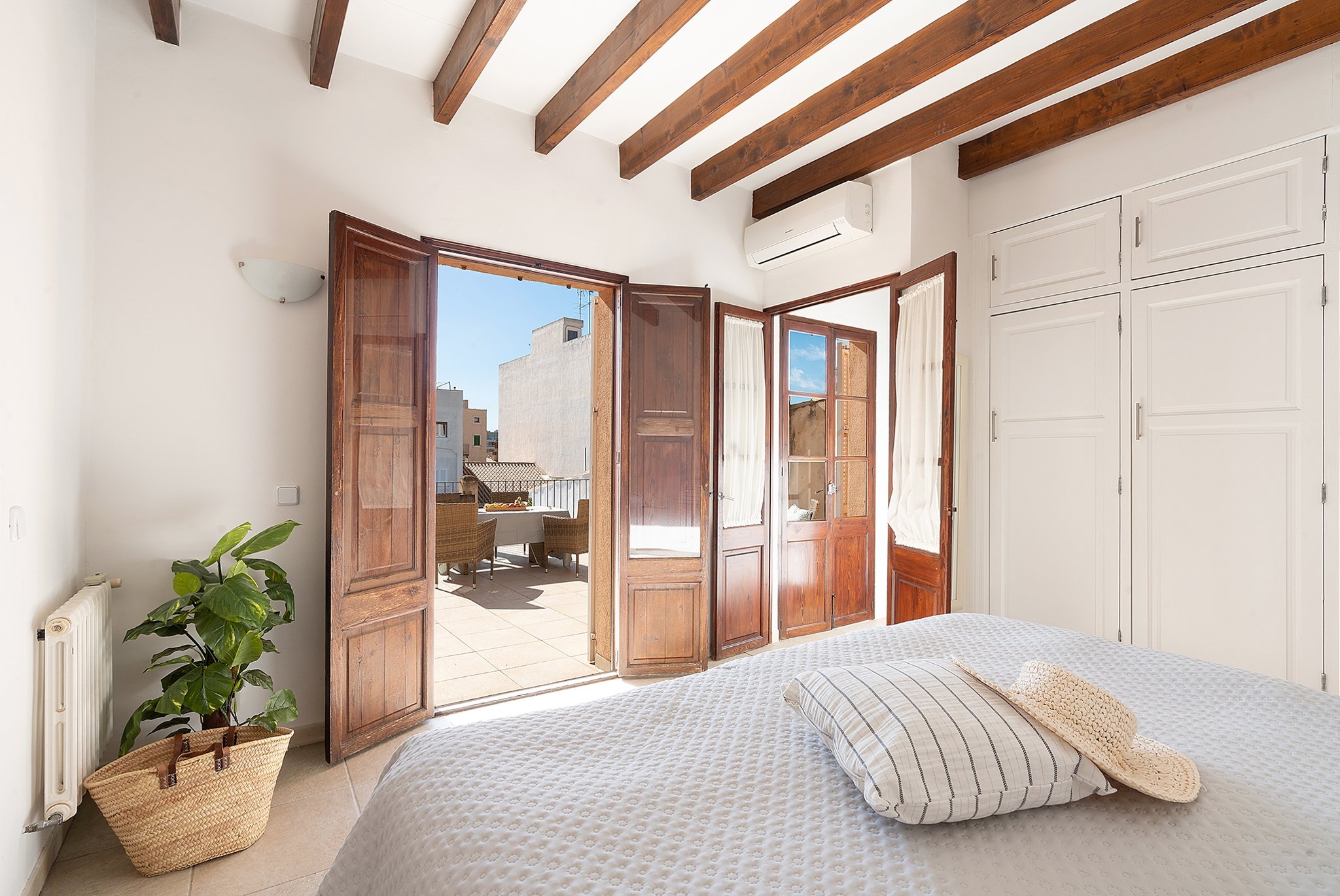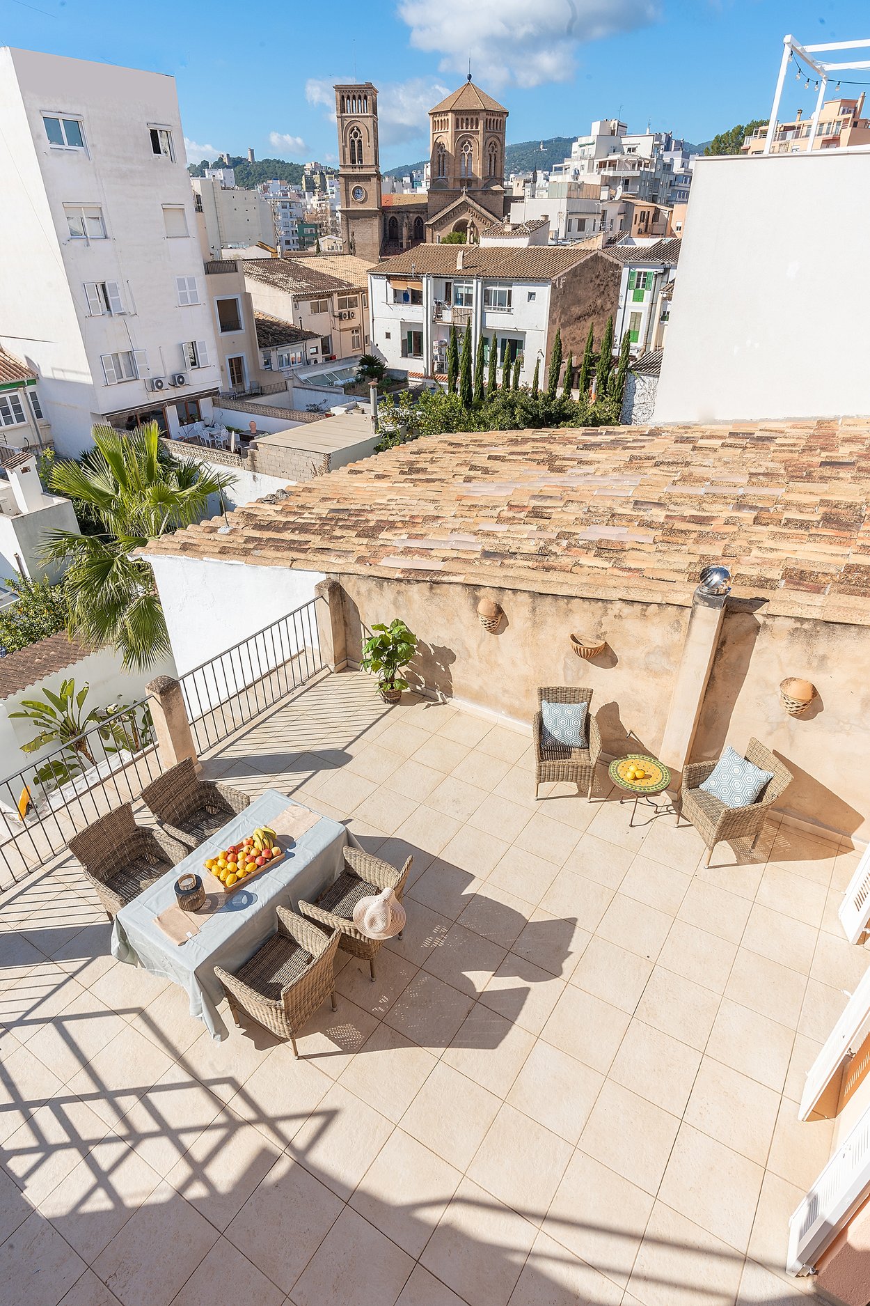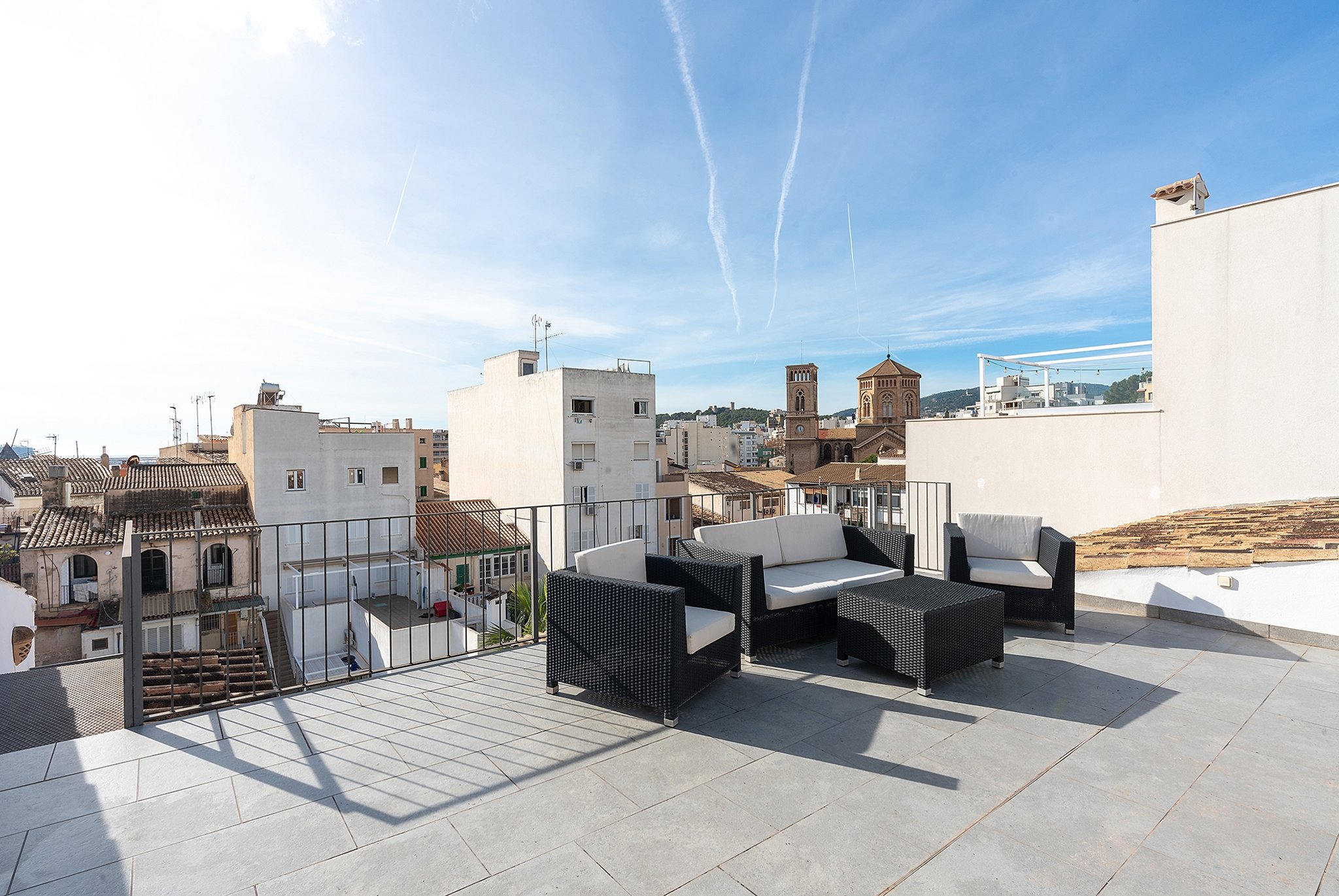 Dieses helle Duplex-Penthouse ist ein einzigartiges Juwel in fantastischer Lage. Die Wohnfläche von ca. 126 m2 verteilt sich auf zwei Ebenen. Die Eingangsebene besteht aus zwei Schlafzimmern, einem Badezimmer, einem Wohnzimmer mit separater Leseecke und einer frischen Siematic-Küche im offenen Raum. Eine schöne Treppe führt hinauf zum Hauptschlafzimmer, das über ein eigenes Badezimmer und Einbauschränke verfügt. Vom Schlafzimmer aus gelangen Sie auf die fantastische untere Terrasse von 35 m2 in Südlage mit Sonnen- und Windschutz. Auf der unteren Terrasse gibt es außerdem einen kombinierten Abstell- und Waschraum. Eine weitere Treppe führt hinauf zu einer oberen privaten Dachterrasse von 33 m2 mit 360-Grad-Blick auf Palma.