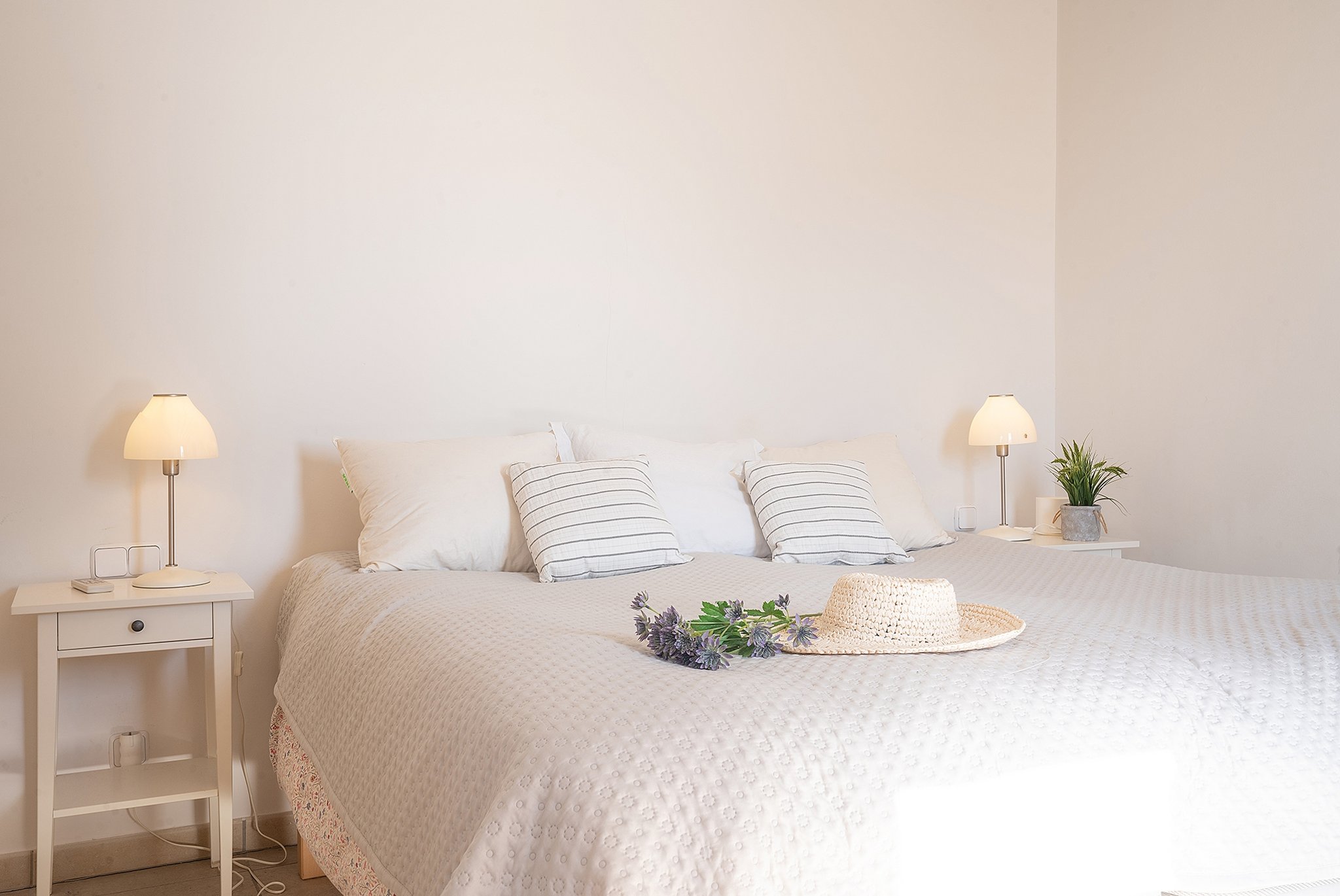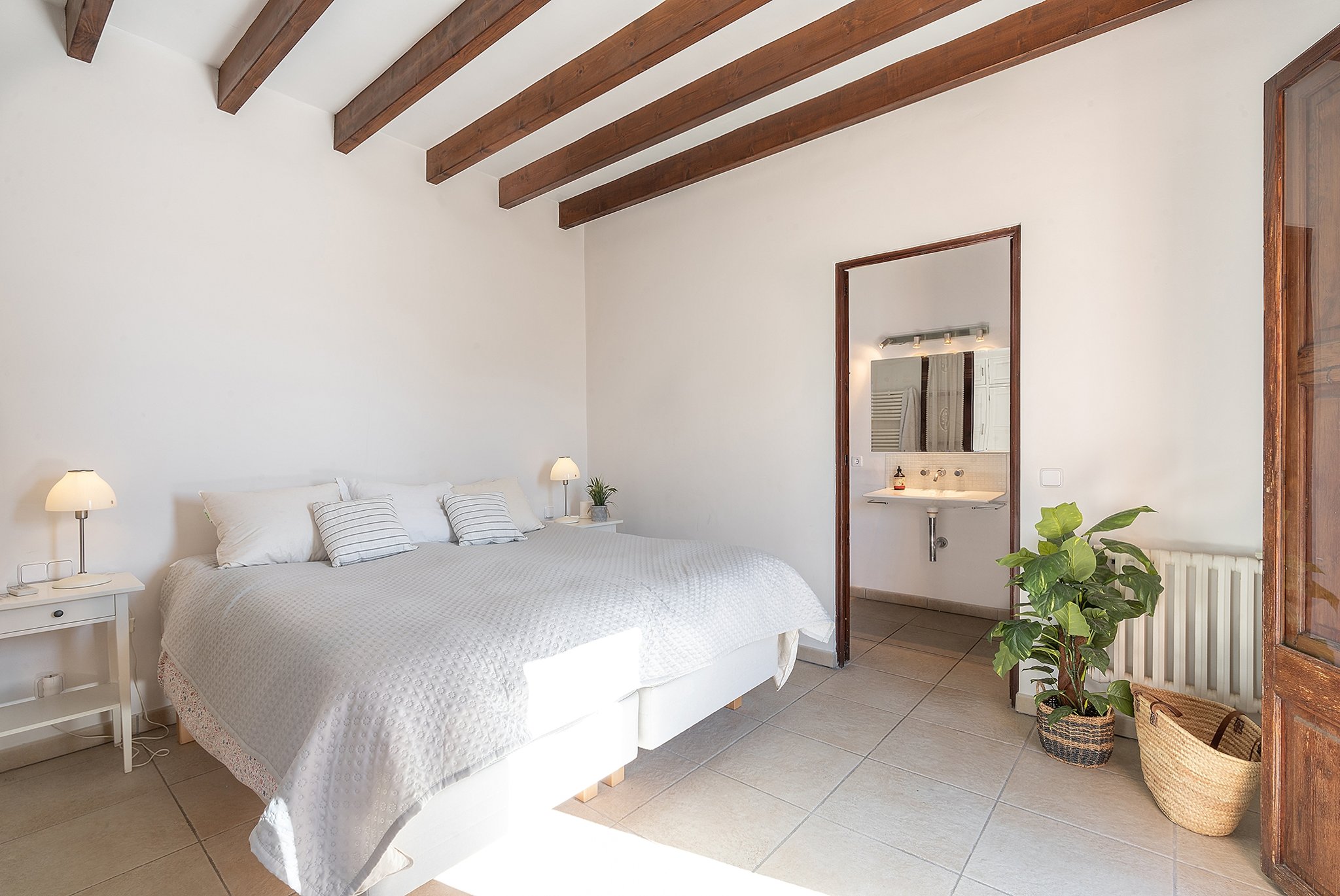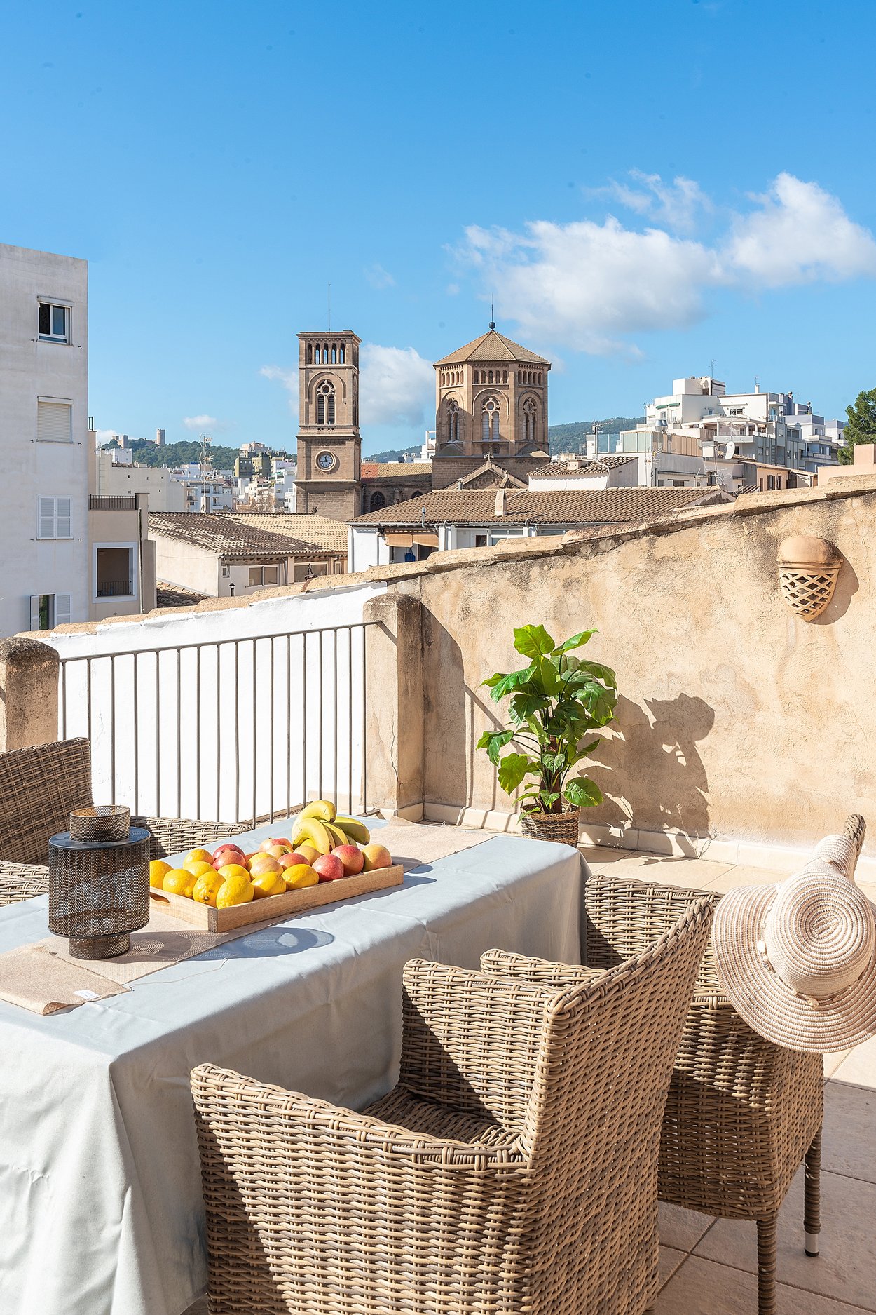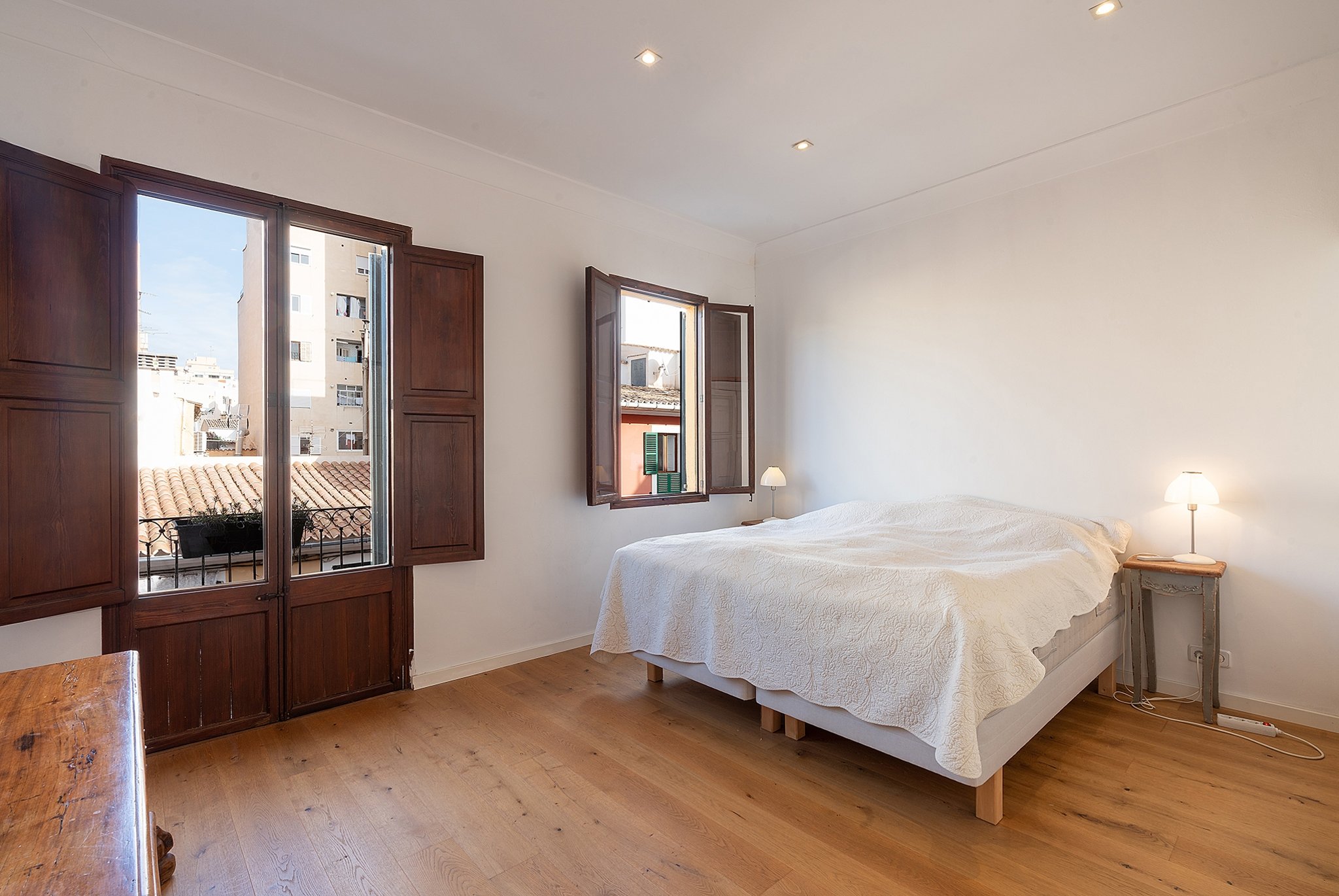 Dieses helle Duplex-Penthouse ist ein einzigartiges Juwel in fantastischer Lage. Die Wohnfläche von ca. 126 m2 verteilt sich auf zwei Ebenen. Die Eingangsebene besteht aus zwei Schlafzimmern, einem Badezimmer, einem Wohnzimmer mit separater Leseecke und einer frischen Siematic-Küche im offenen Raum. Eine schöne Treppe führt hinauf zum Hauptschlafzimmer, das über ein eigenes Badezimmer und Einbauschränke verfügt. Vom Schlafzimmer aus gelangen Sie auf die fantastische untere Terrasse von 35 m2 in Südlage mit Sonnen- und Windschutz. Auf der unteren Terrasse gibt es außerdem einen kombinierten Abstell- und Waschraum. Eine weitere Treppe führt hinauf zu einer oberen privaten Dachterrasse von 33 m2 mit 360-Grad-Blick auf Palma.