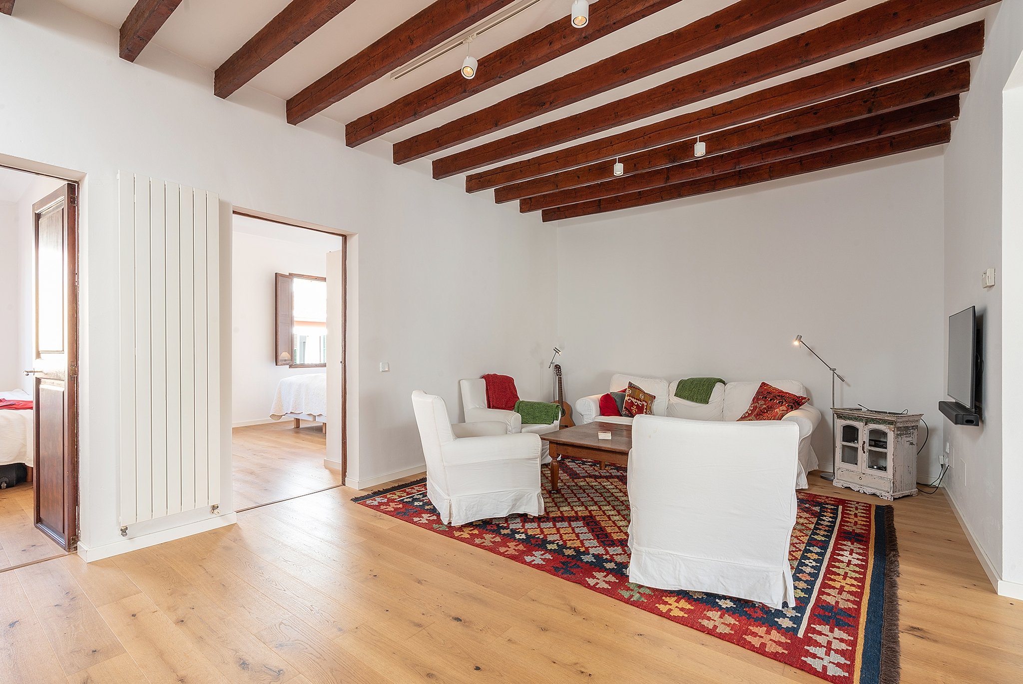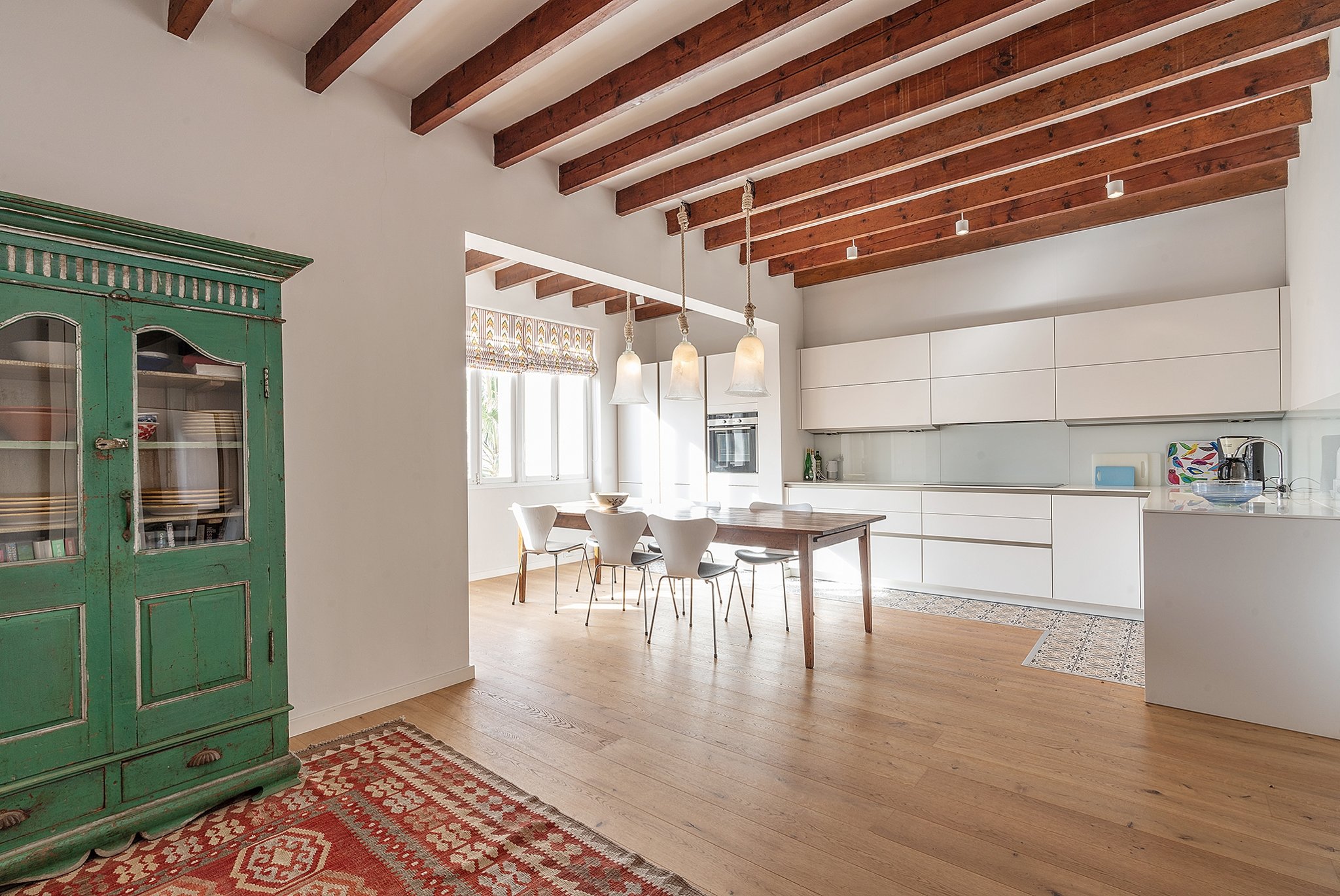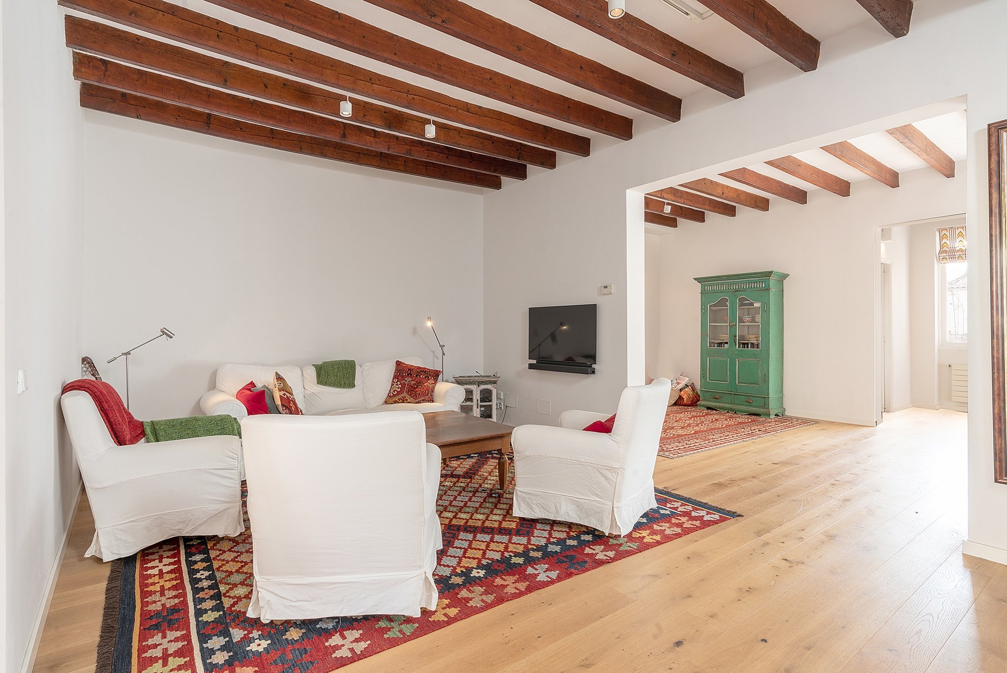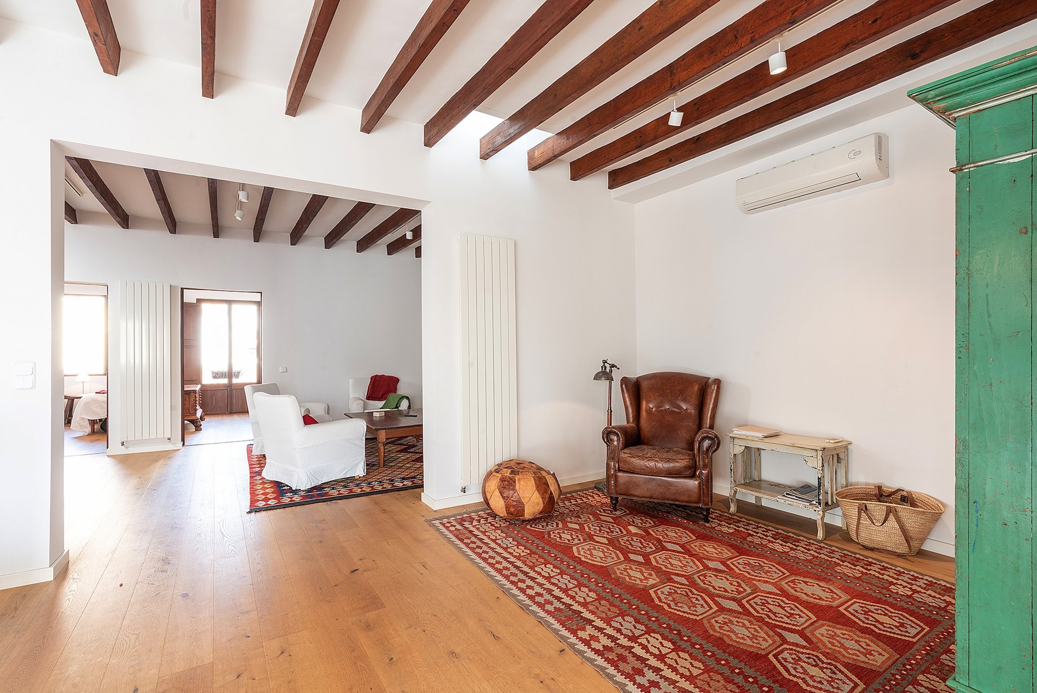 Die Wohnung ist unglaublich charmant mit sichtbaren Deckenbalken und mehreren erhaltenen Originaldetails. Das Gebäude verfügt über insgesamt drei Wohnungen.