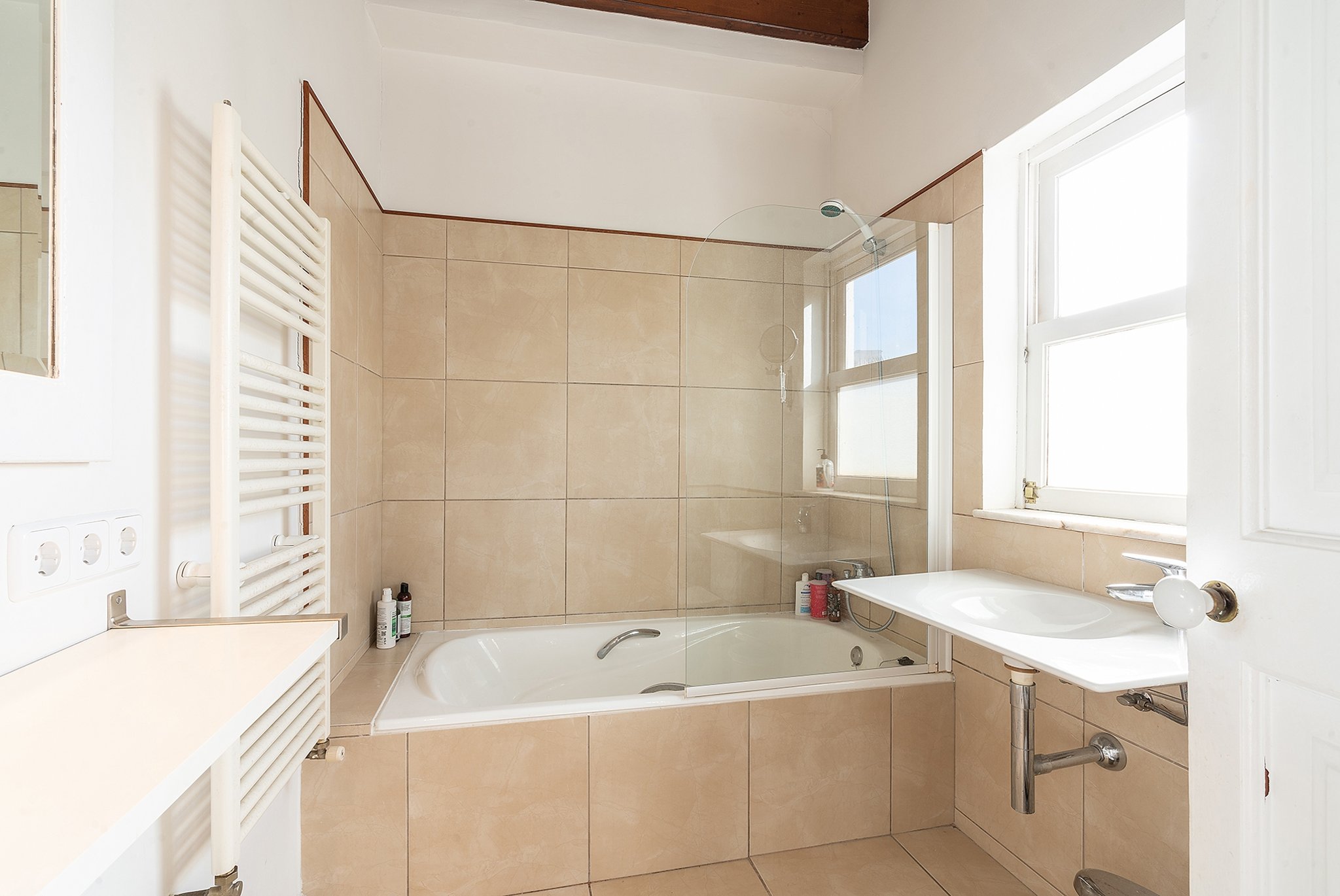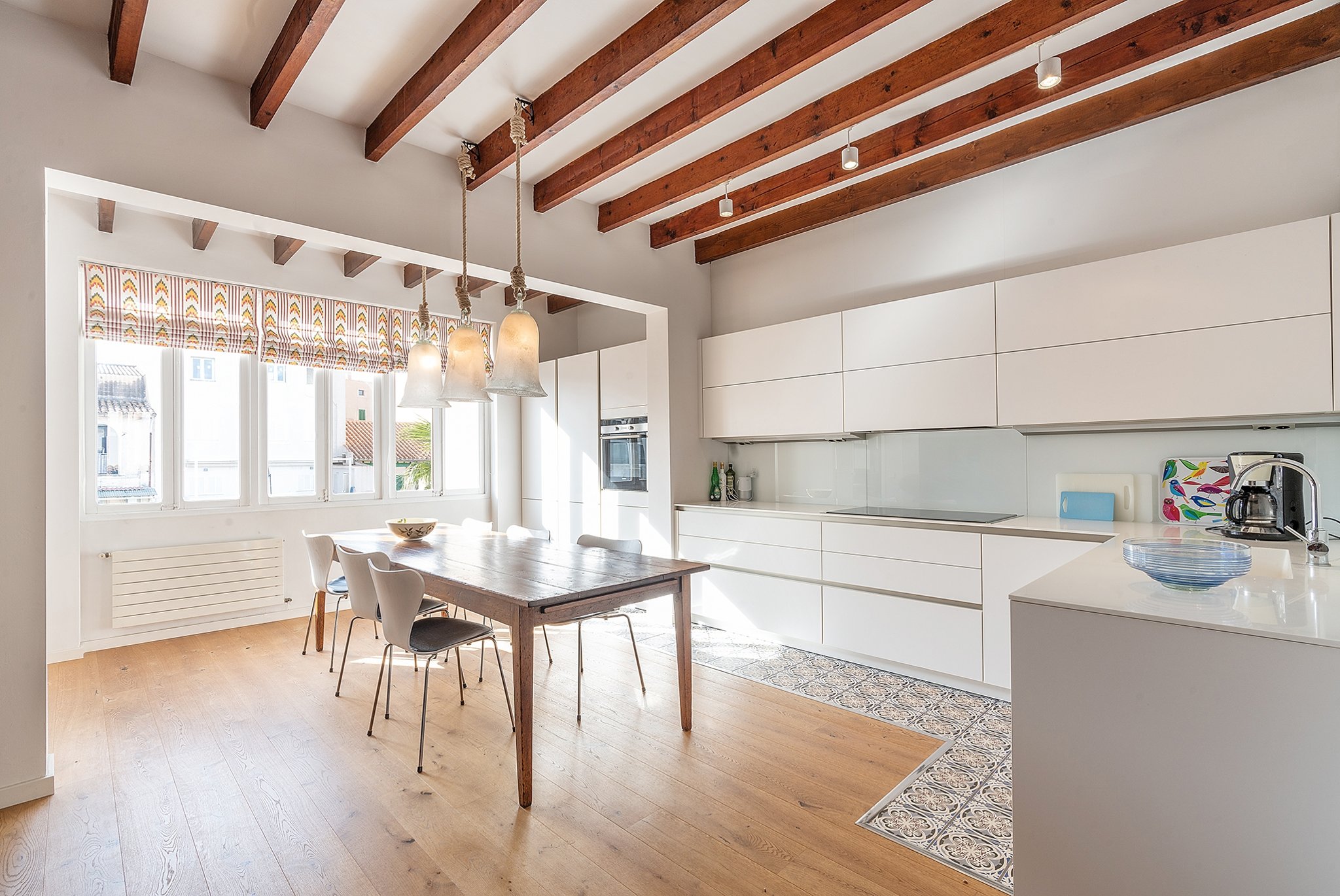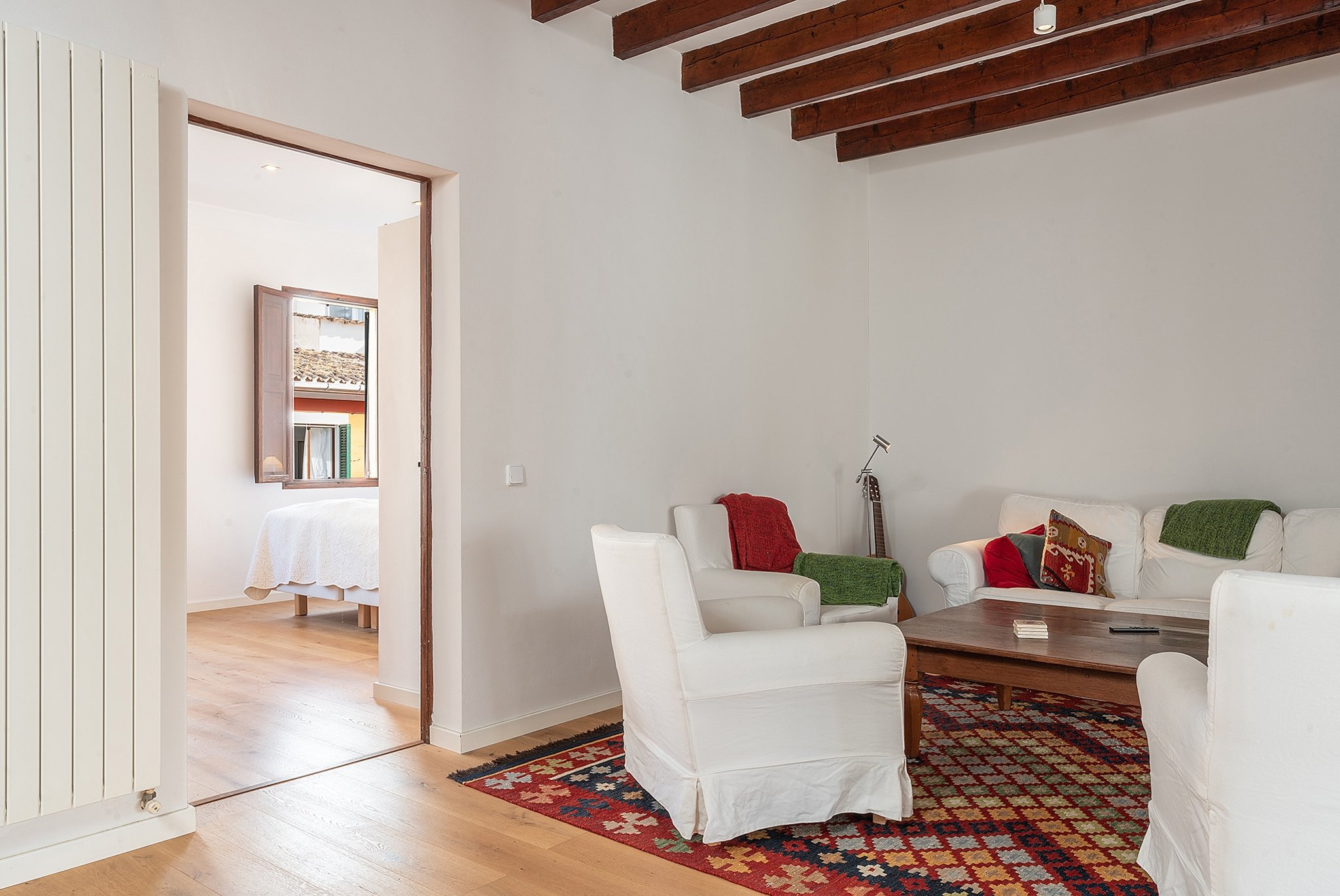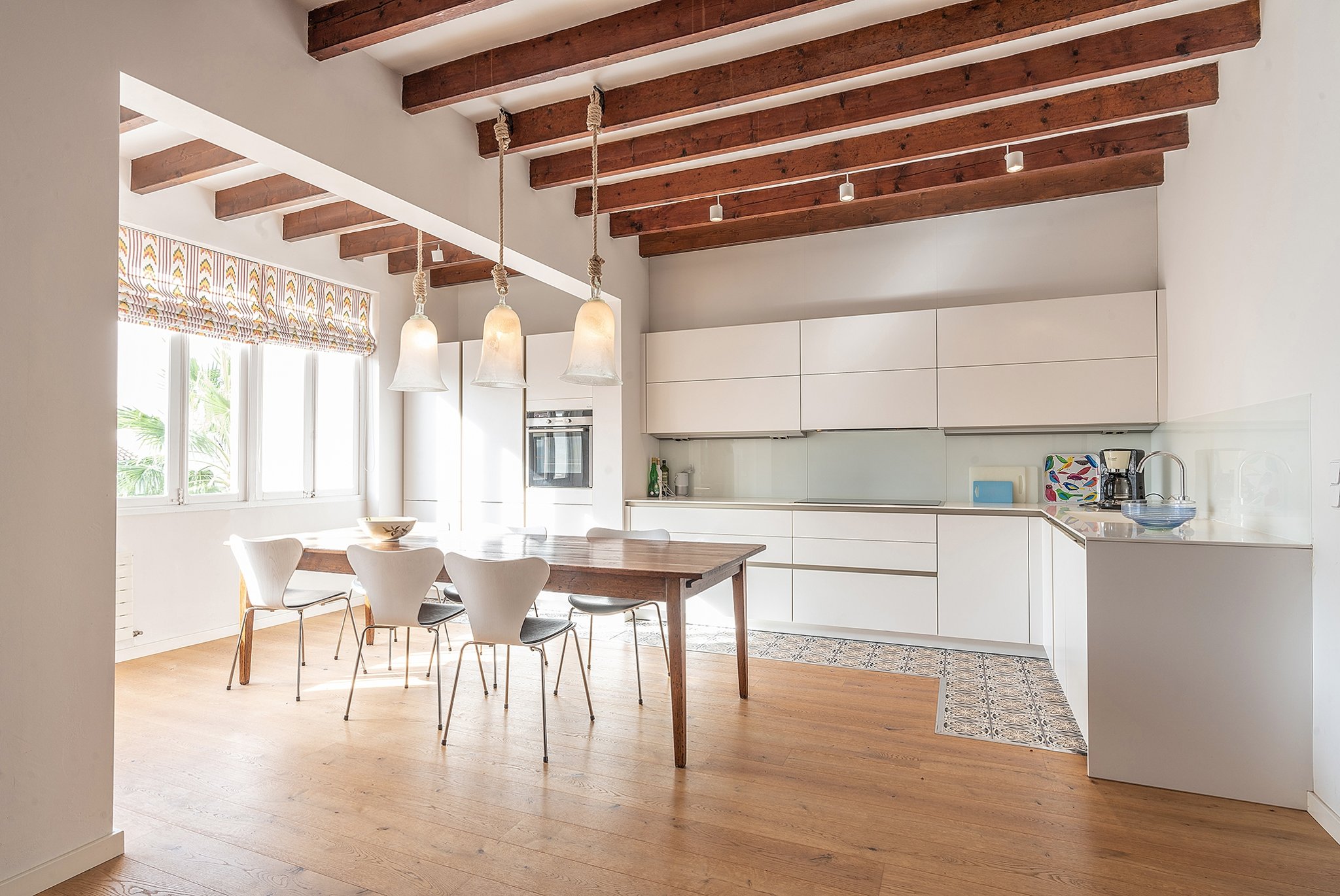 Die Wohnung ist unglaublich charmant mit sichtbaren Deckenbalken und mehreren erhaltenen Originaldetails. Das Gebäude verfügt über insgesamt drei Wohnungen.