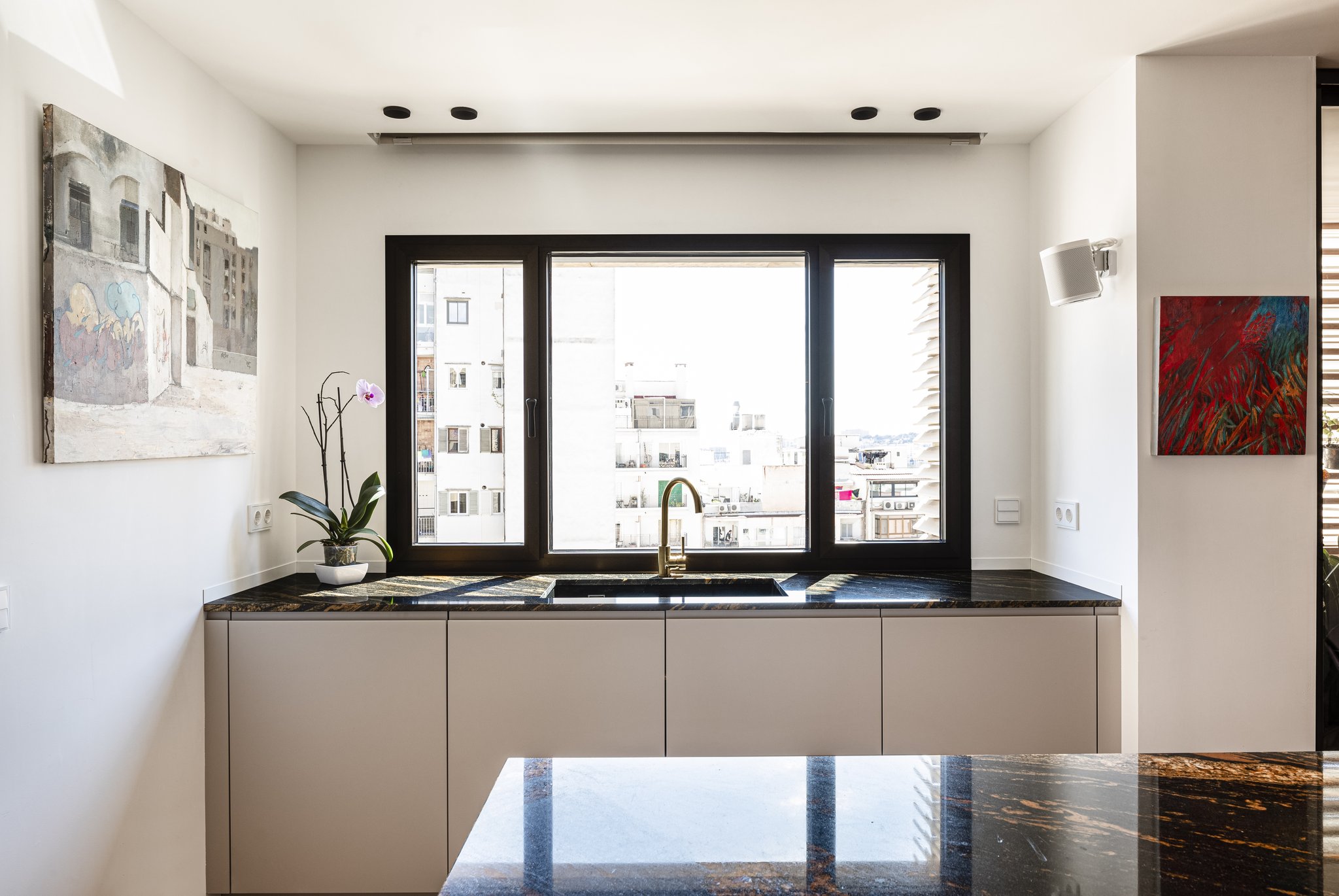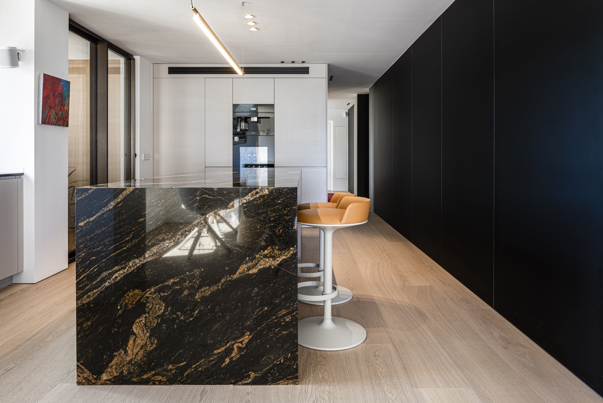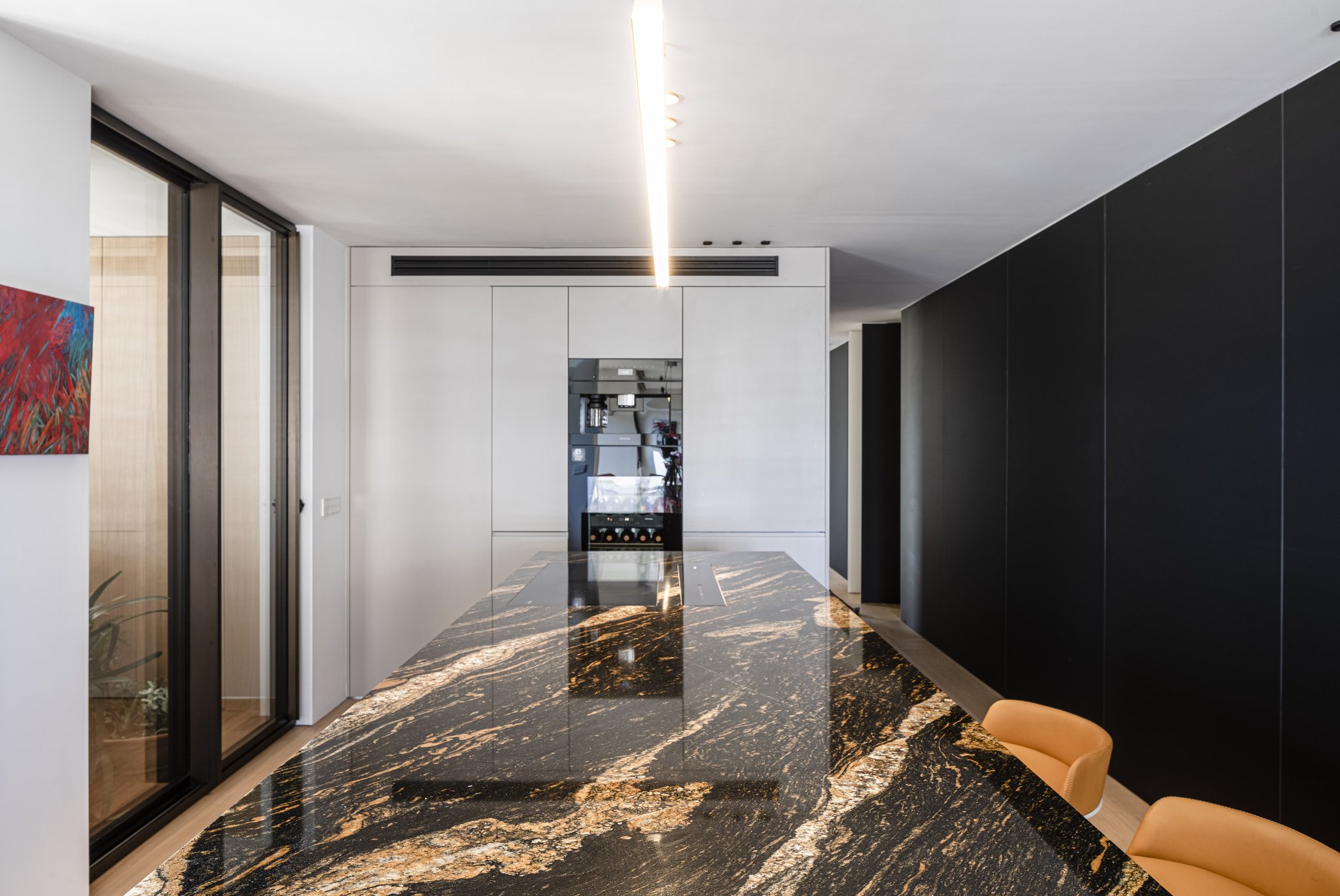 Die fast 200 m2 große Wohnung wurde mit höchster Qualität renoviert und bietet ein modernes Design und eine optimale Aufteilung für maximalen Komfort. Sie bietet ein Büro mit Zugang zu einer großen Südterrasse, einen geräumigen Flur, ein Gäste-WC und 2 Schlafzimmer mit Badezimmern en-suite. Das Highlight dieses Apartments ist die in das helle Wohn- und Esszimmer integrierte Küche, die mit einer großzügigen Kücheninsel und modernsten Miele- und Neff-Geräten, einer professionellen Kaffeemaschine und einem Weinkeller ausgestattet ist. Für zusätzlichen Komfort gibt es auch eine große separate Waschküche. Ein Garagenstellplatz und ein Abstellraum sind ebenfalls enthalten.
