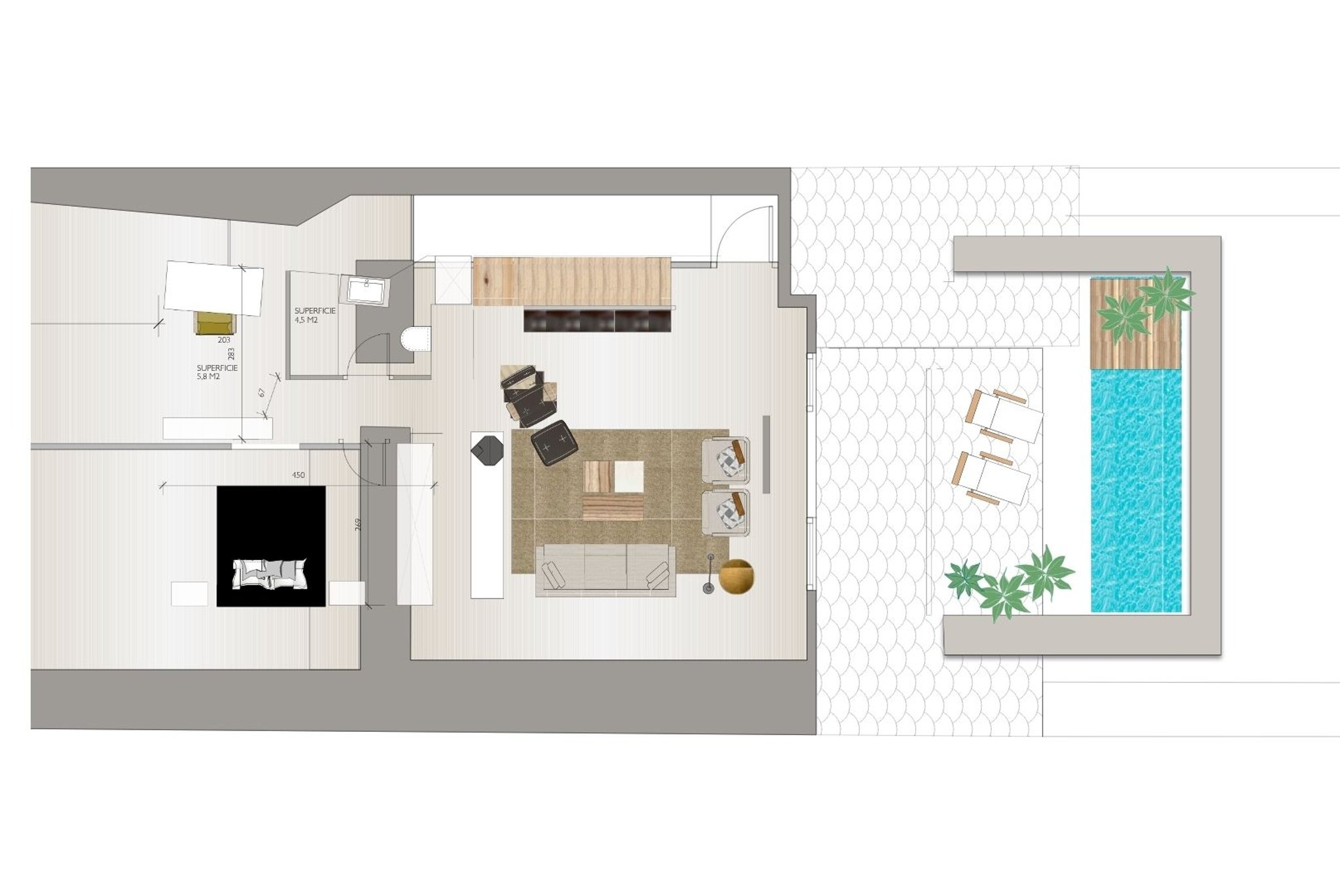 Das Haus hat dazu eine große Dachterrasse, die die Möglichkeit bietet, eine zusätzliche Etage zu bauen.
