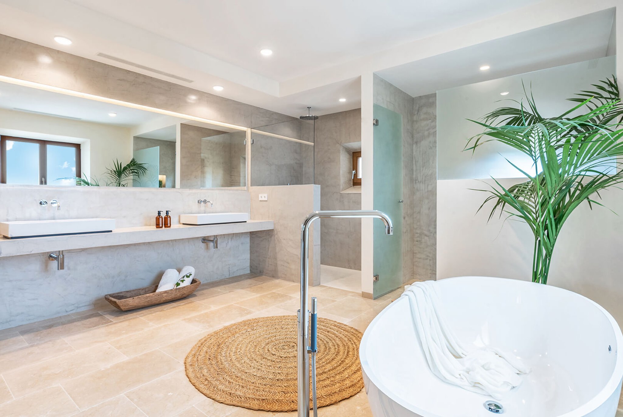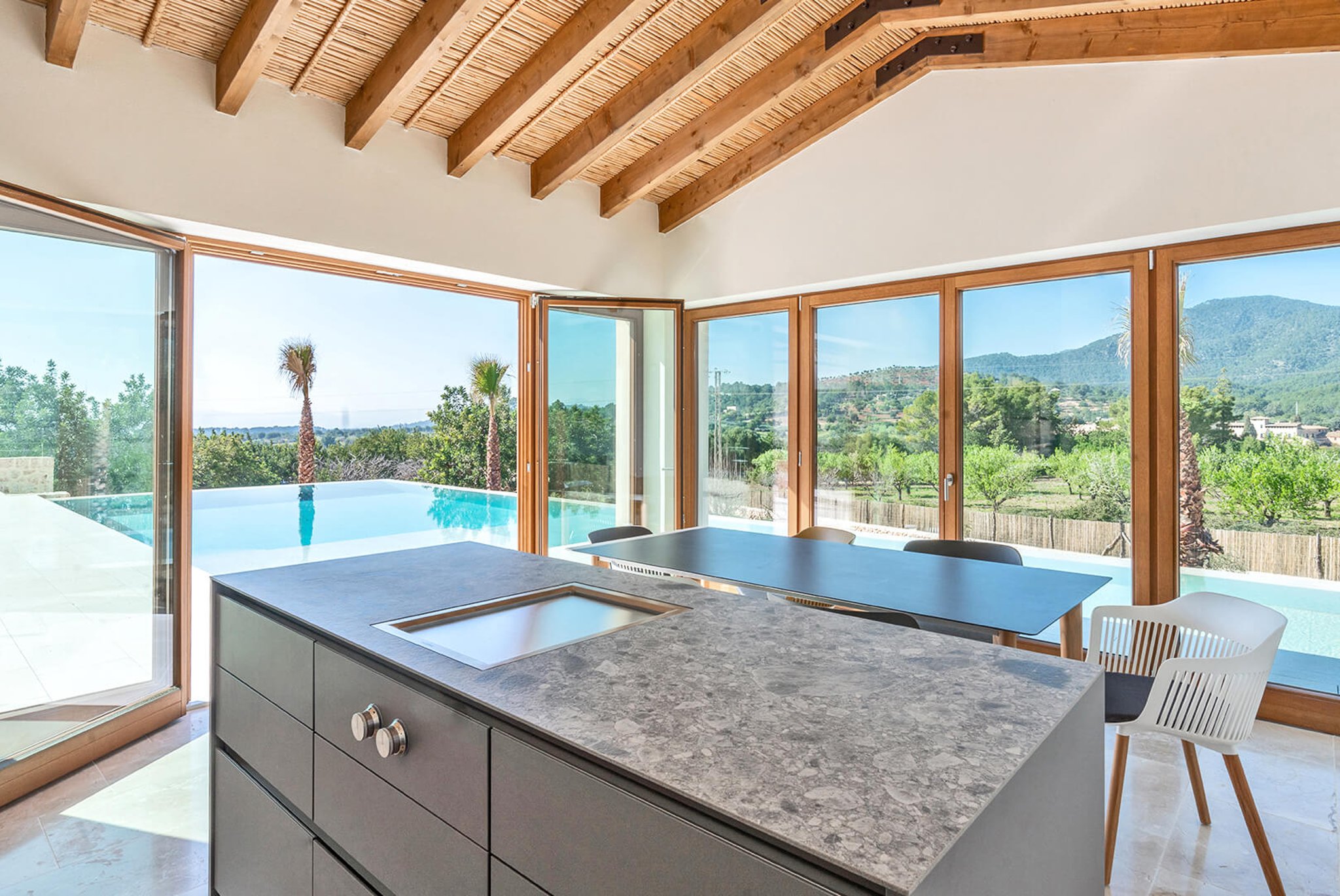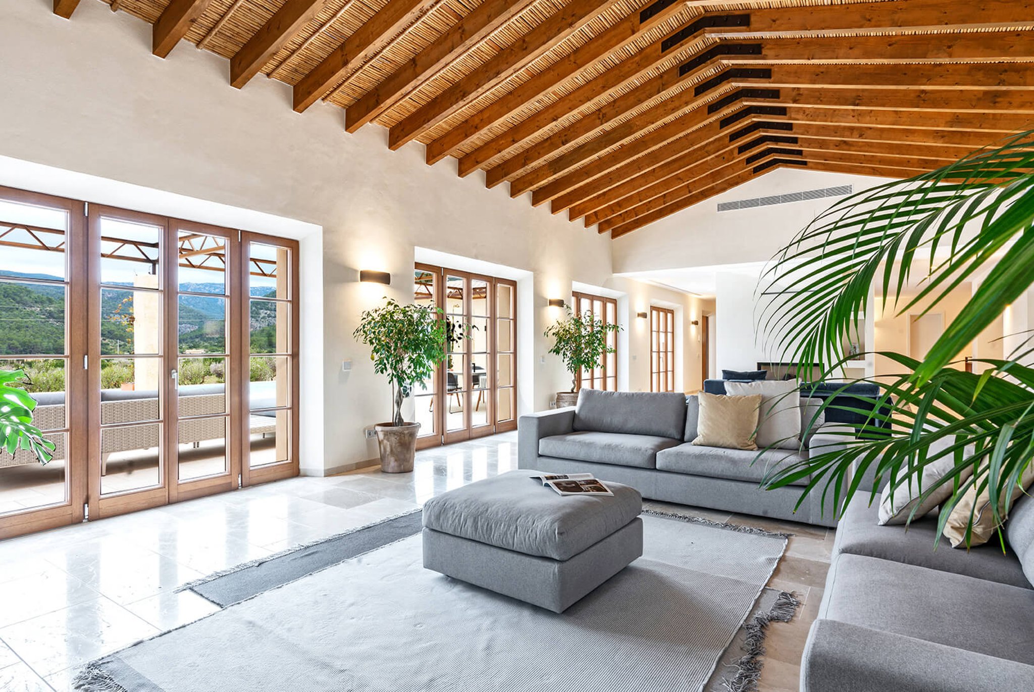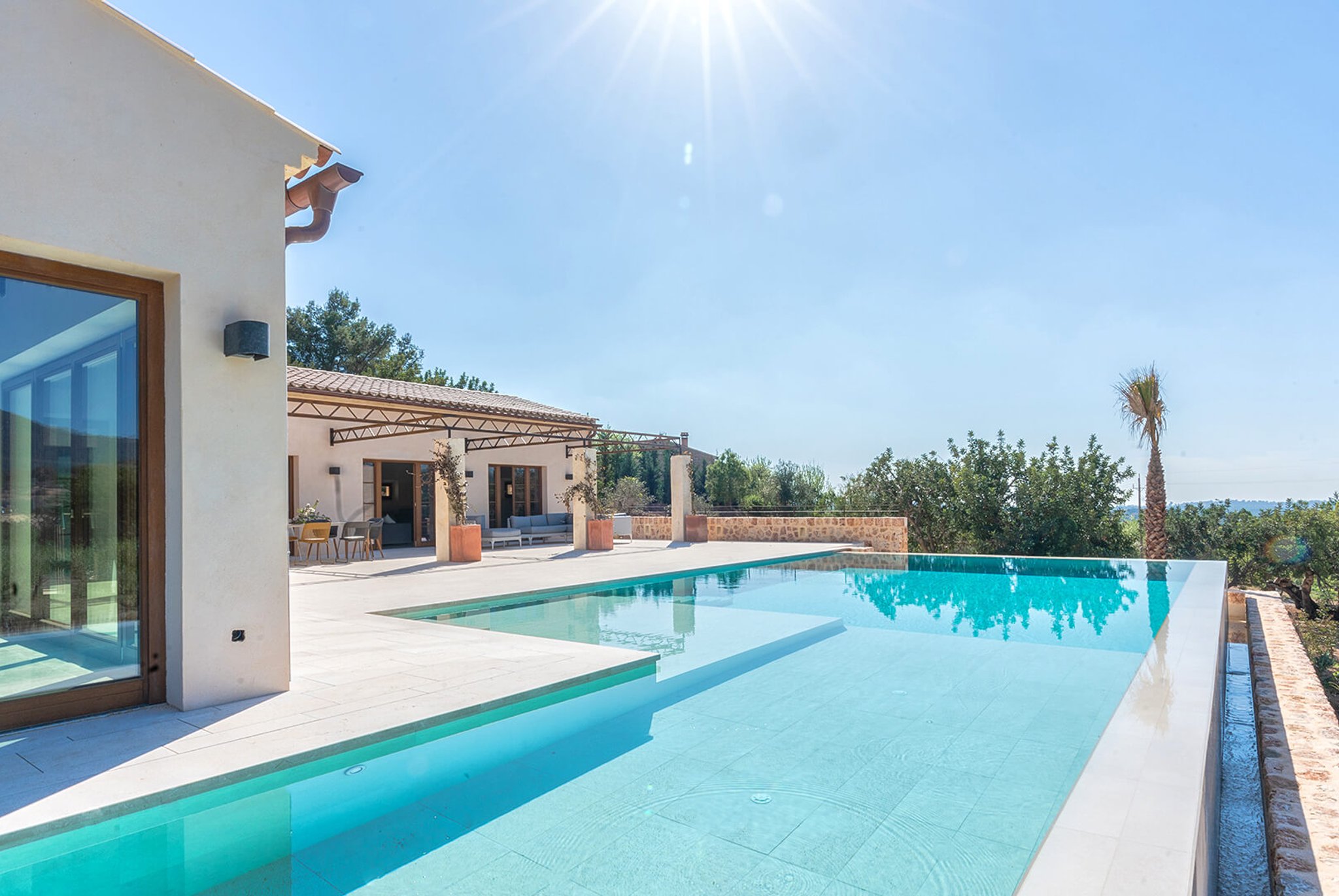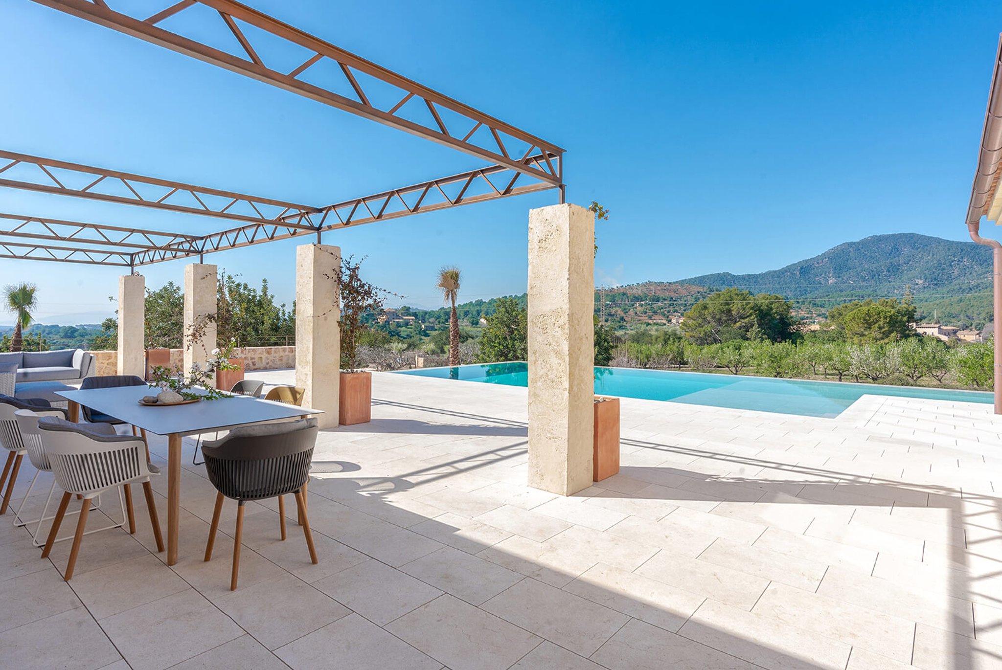 Das gesamte Anwesen ist nach Palma ausgerichtet und bietet einen fantastischen Panoramablick und absolute Privatsphäre. Der Stil ist zeitgenössisch und dennoch mediterran. Der bekannte Architekt Bernardo Oliver steht für authentische Bauten mit moderner Umsetzung. Die Gegend von Santa Maria wird auch von vielen Mandelbäumen, Johannisbrotbäumen und Weinfeldern dominiert. Sie liegt malerisch vor dem Tramuntana-Gebirge, die Kirche ist schon von weitem zu sehen. Santa Maria bietet sich als Ausgangspunkt für zahlreiche Ausflüge in die Berge an. Palma ist in ca. 15 Minuten zu erreichen, ebenso Strände und der Flughafen in 20 Minuten. Die Haupteinkaufsstraße im Dorf bietet eine gute Auswahl an Geschäften, Cafés, Bars und Restaurants.