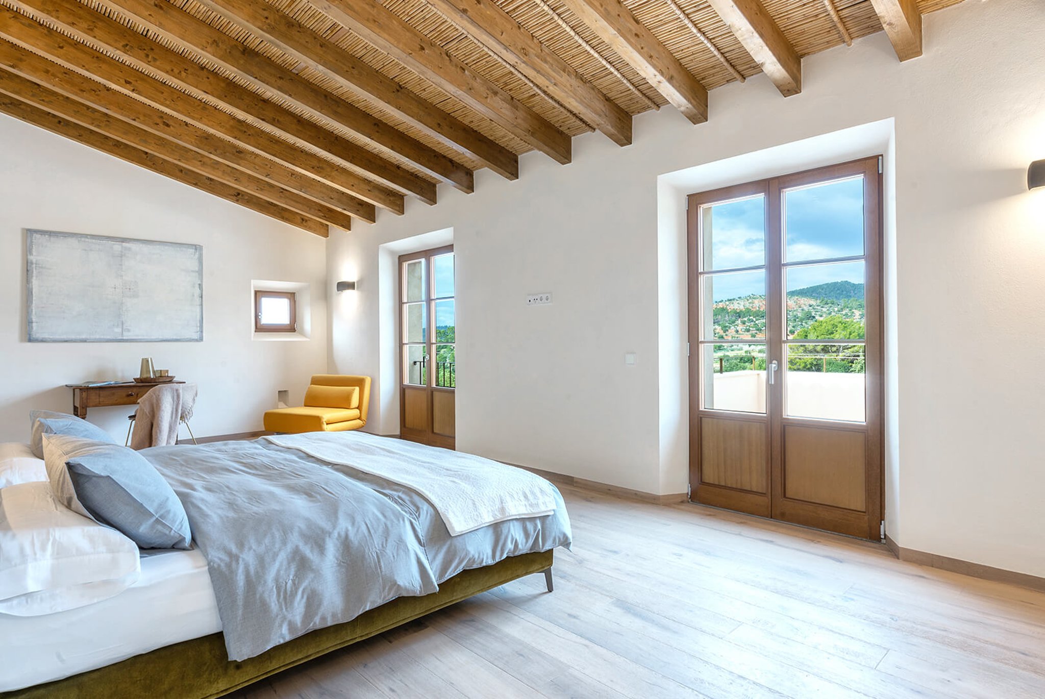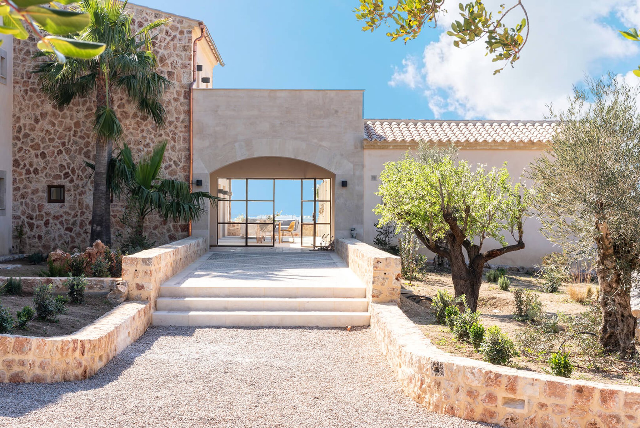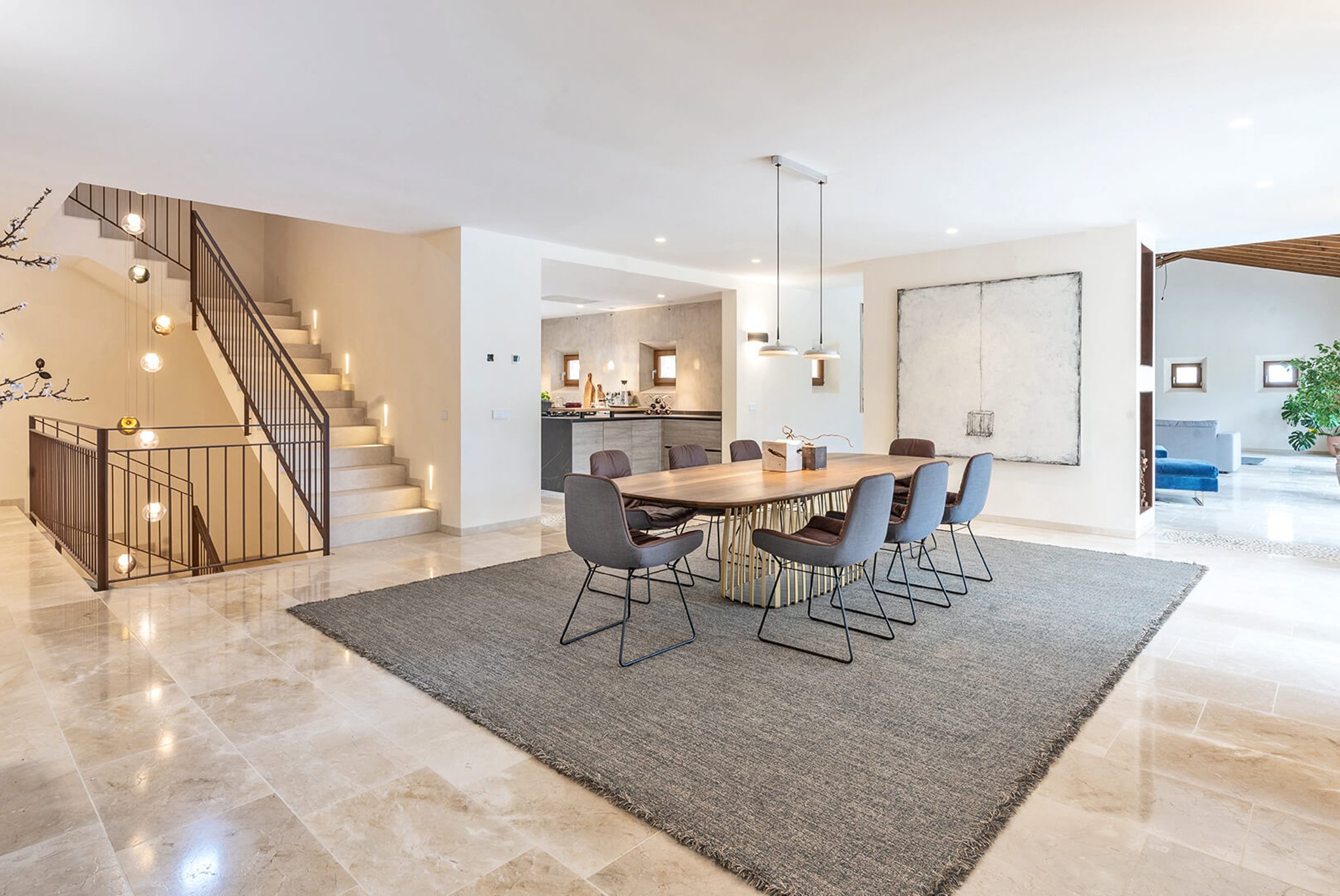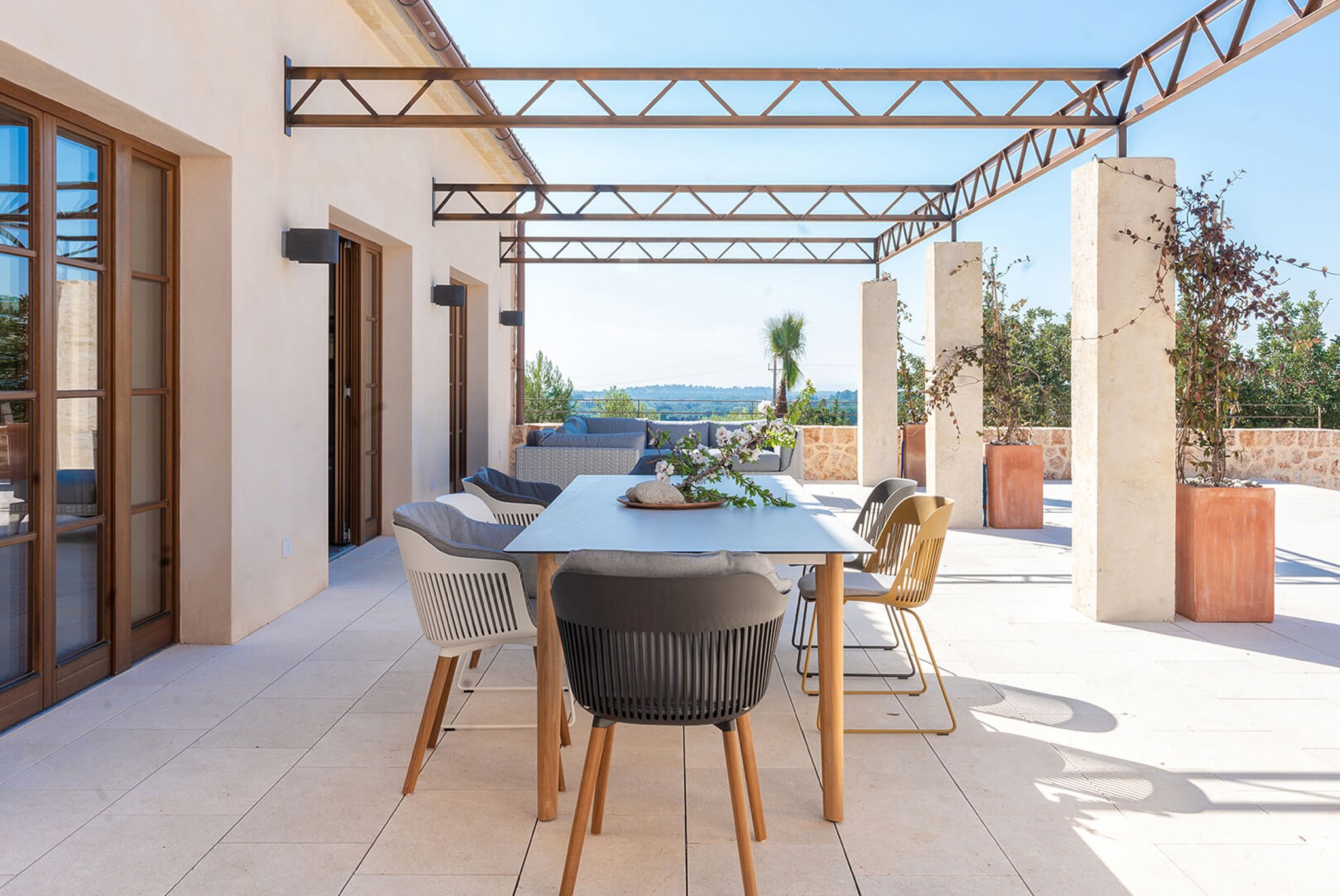Das gesamte Anwesen ist nach Palma ausgerichtet und bietet einen fantastischen Panoramablick und absolute Privatsphäre. Der Stil ist zeitgenössisch und dennoch mediterran. Der bekannte Architekt Bernardo Oliver steht für authentische Bauten mit moderner Umsetzung. Die Gegend von Santa Maria wird auch von vielen Mandelbäumen, Johannisbrotbäumen und Weinfeldern dominiert. Sie liegt malerisch vor dem Tramuntana-Gebirge, die Kirche ist schon von weitem zu sehen. Santa Maria bietet sich als Ausgangspunkt für zahlreiche Ausflüge in die Berge an. Palma ist in ca. 15 Minuten zu erreichen, ebenso Strände und der Flughafen in 20 Minuten. Die Haupteinkaufsstraße im Dorf bietet eine gute Auswahl an Geschäften, Cafés, Bars und Restaurants.
