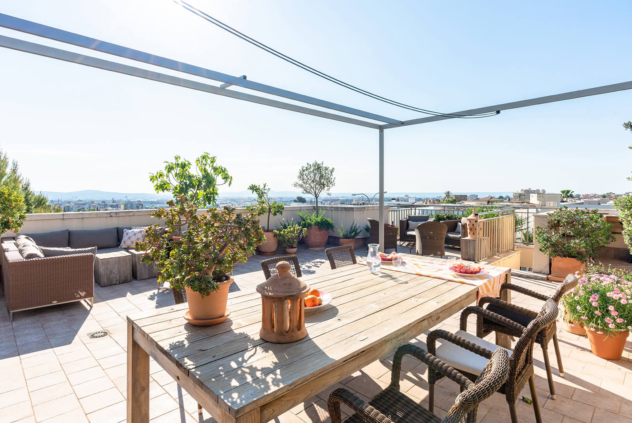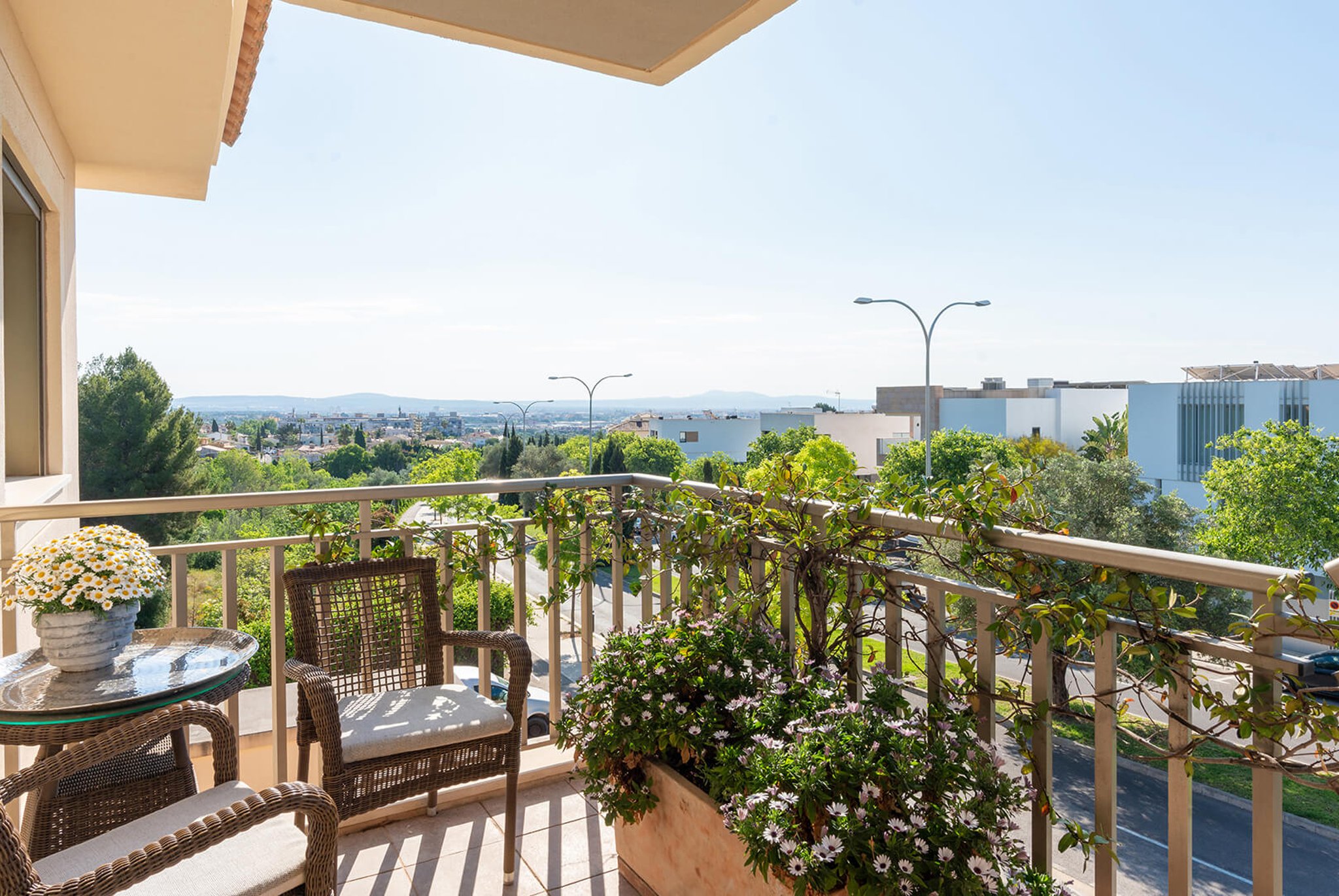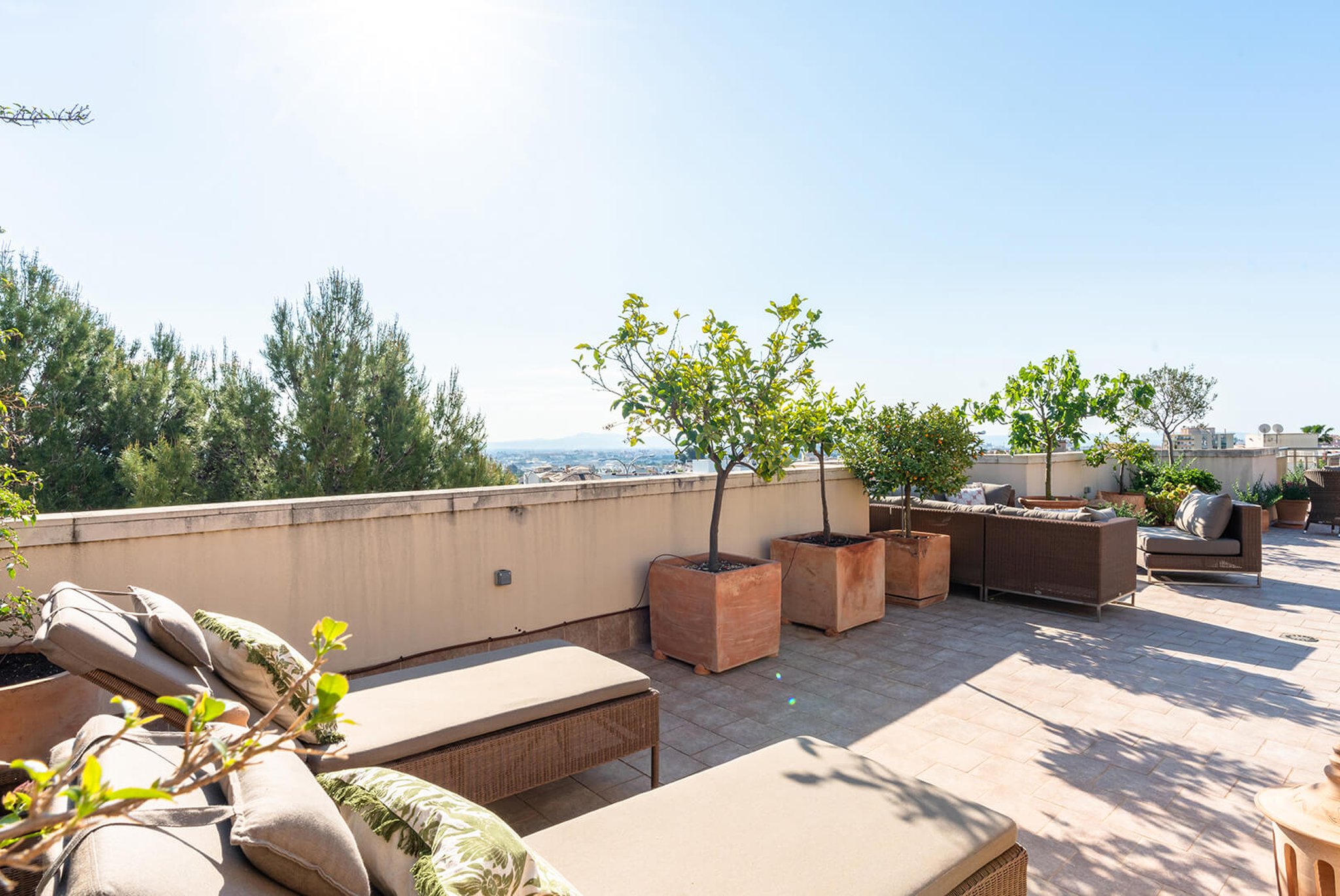Die Wohnung hat eine Wohnfläche von ca. 109 m2 die sich auf eine halboffene Küche, ein Wohnzimmer mit Essbereich, vier Schlafzimmer, Abstellräume und drei Badezimmer sowie eine Waschküche verteilt. Die Wohnung ist nach Süden ausgerichtet, was viel natürliches Licht und viele Sonnenstunden auf der großen Dachterrasse (130 m2) mit Blick auf Palma, die Berge und das Meer bedeutet. Das Wohnzimmer hat Zugang zu einem Balkon und eine Treppe führt hinauf zur Dachterrasse. Der Wohnkomplex hat einen schönen Garten und einen Gemeinschaftspool. Zur Wohnung gehört auch ein Stellplatz und ein Abstellraum. Gleich hinter dem Haus beginnen mehrere schöne Wanderwege.