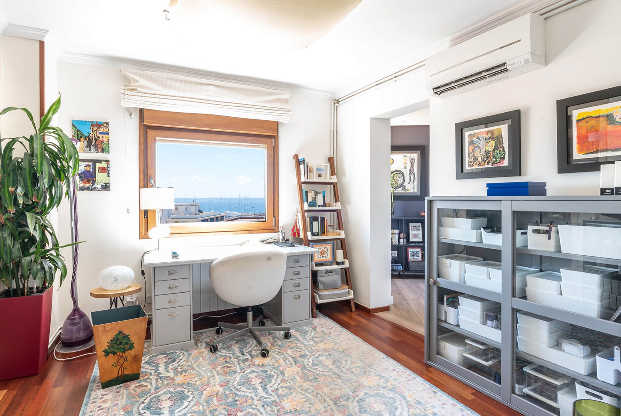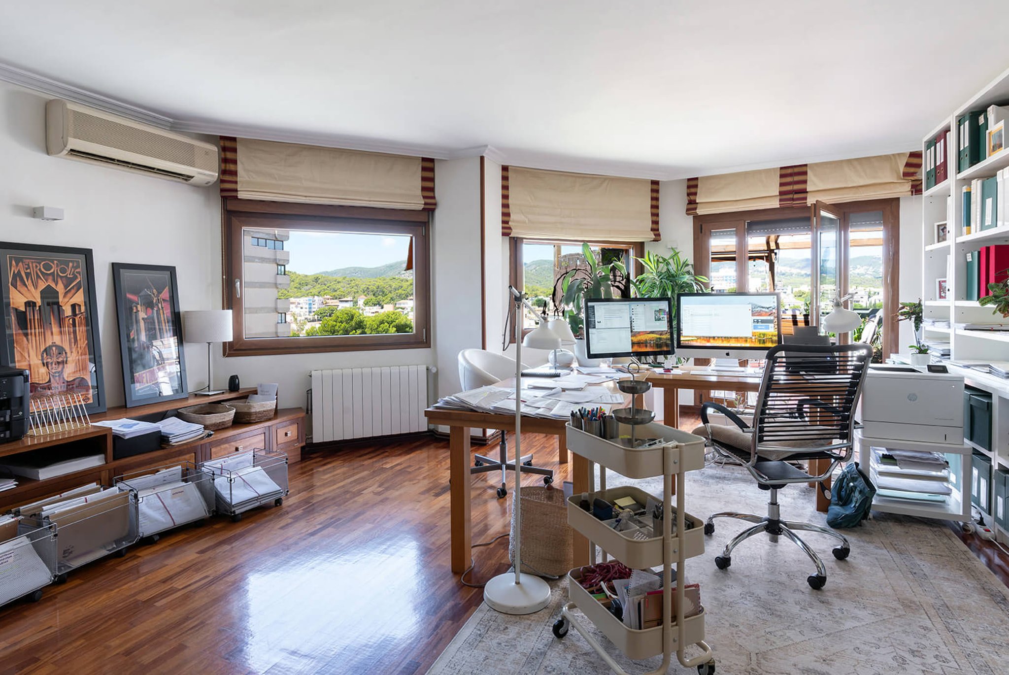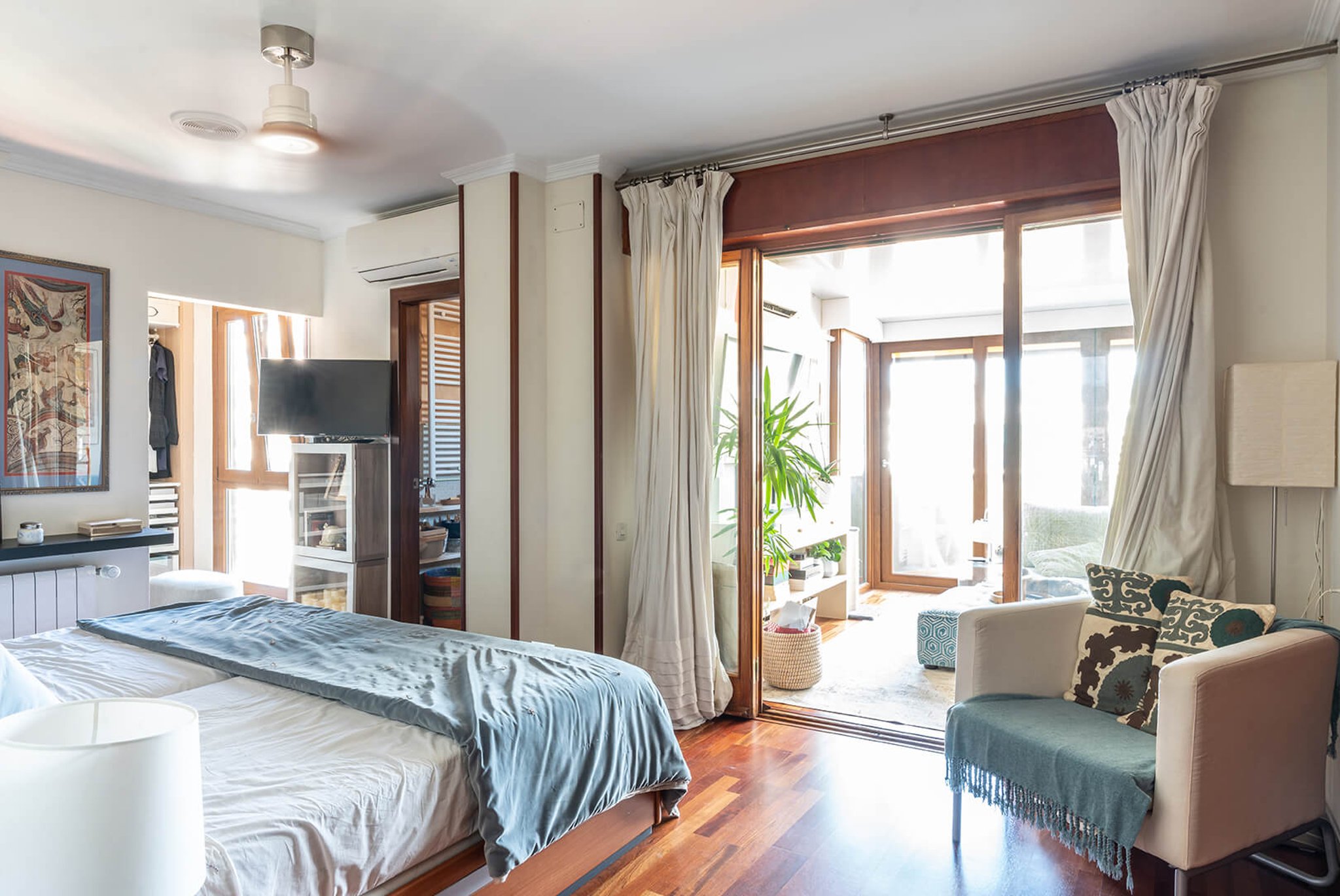 Im Obergeschoss befindet sich der private Schlafbereich, in dem das Hauptschlafzimmer über ein eigenes Bad, eine eigene kleine Lounge und eine große Terrasse mit Blick auf die Berge im Westen verfügt. Es gibt auch einen großen begehbaren Kleiderschrank, der früher ein Schlafzimmer war. Auf dieser Etage befinden sich zwei weitere Schlafzimmer mit Blick auf Palma und das Wasser sowie ein Badezimmer.
