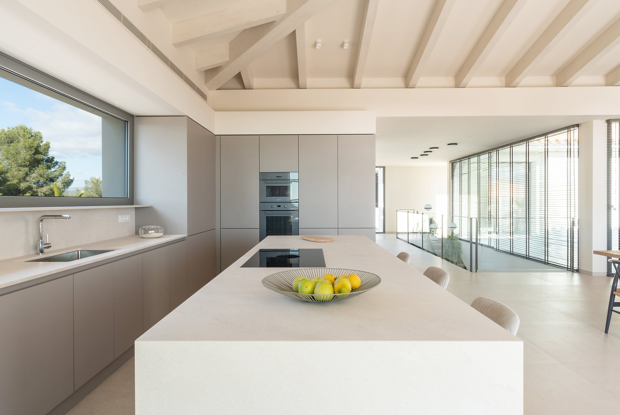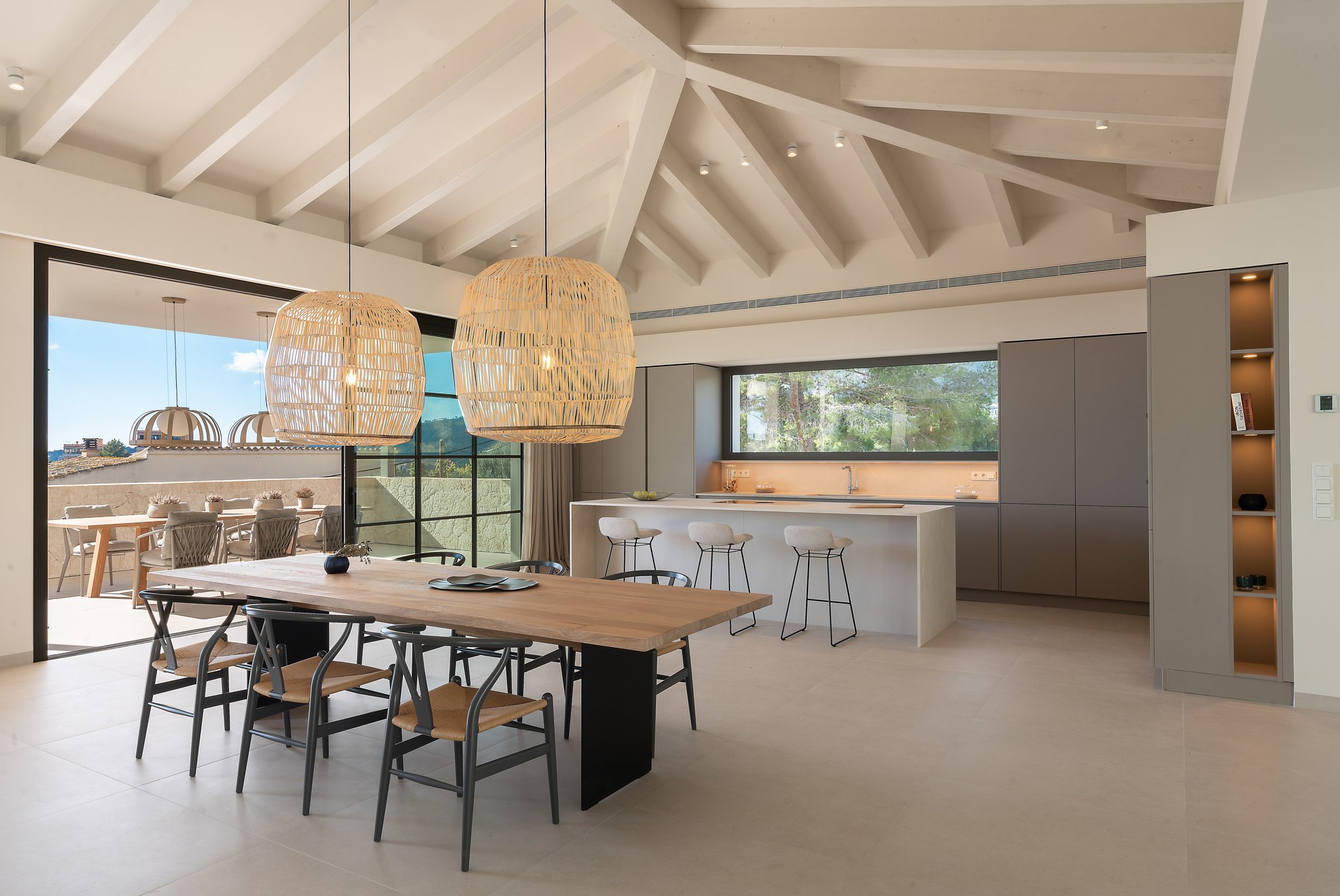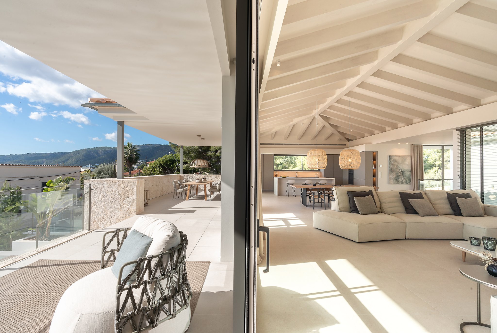 Eine schöne Treppe führt Sie auf die nächste Ebene, wo sich die große offene Küche und das Wohn-/Esszimmer mit Kamin und hohen Decken mit erstaunlichen Dachbalken befinden. Die Aussicht, die Sie hier willkommen heißt, ist absolut atemberaubend mit dem Pool mit Blick auf das Meer. Die großen, vom Boden bis zur Decke reichenden Fenster verleihen diesem geräumigen Zimmer einen wunderbaren natürlichen Lichteinfall und die Schiebetüren öffnen sich so, dass der Innenbereich eins mit dem Außenbereich wird. Der Salzwasserpool ist der perfekte Ort für die warmen Sommertage und es gibt auch einen Grill, um den Platz mit Freunden und Familie zu genießen. Die Terrasse und der Garten sind komplett mit hochwertigen Möbeln von Terraza Balear ausgestattet. Auf dieser Ebene finden wir das große Hauptschlafzimmer mit Badezimmer en-suite, das sowohl eine Dusche als auch eine große Badewanne umfasst, sowie ein weiteres Schlafzimmer und eine Gästetoilette. Dies ist ein Haus, das durch Qualität, Raum und nicht zuletzt durch seine atemberaubende Aussicht beeindrucken wird!