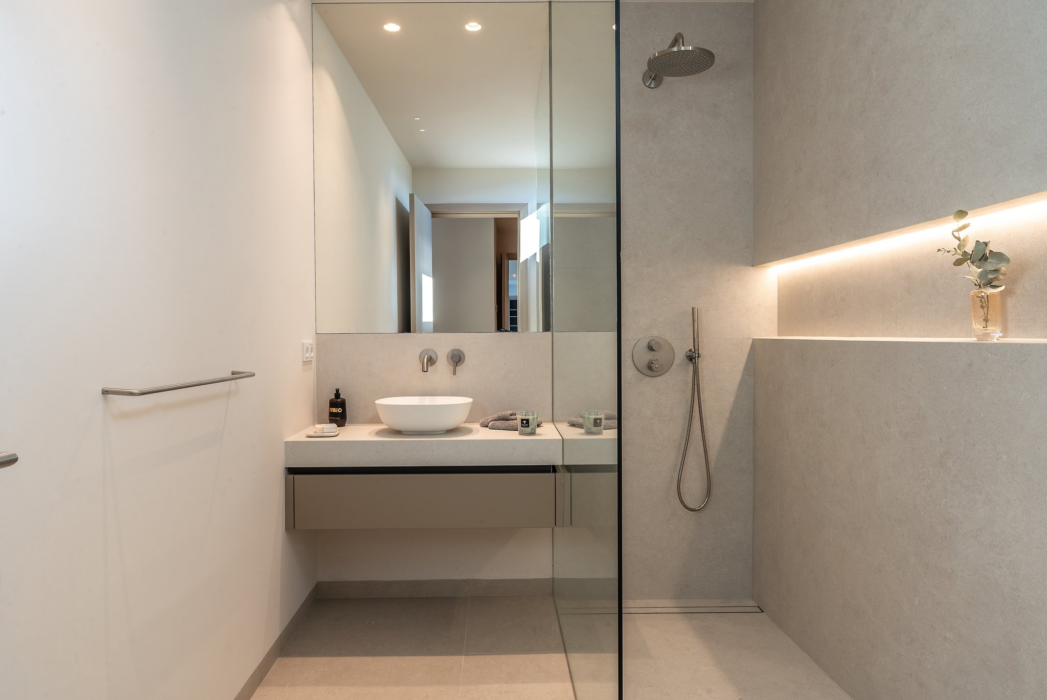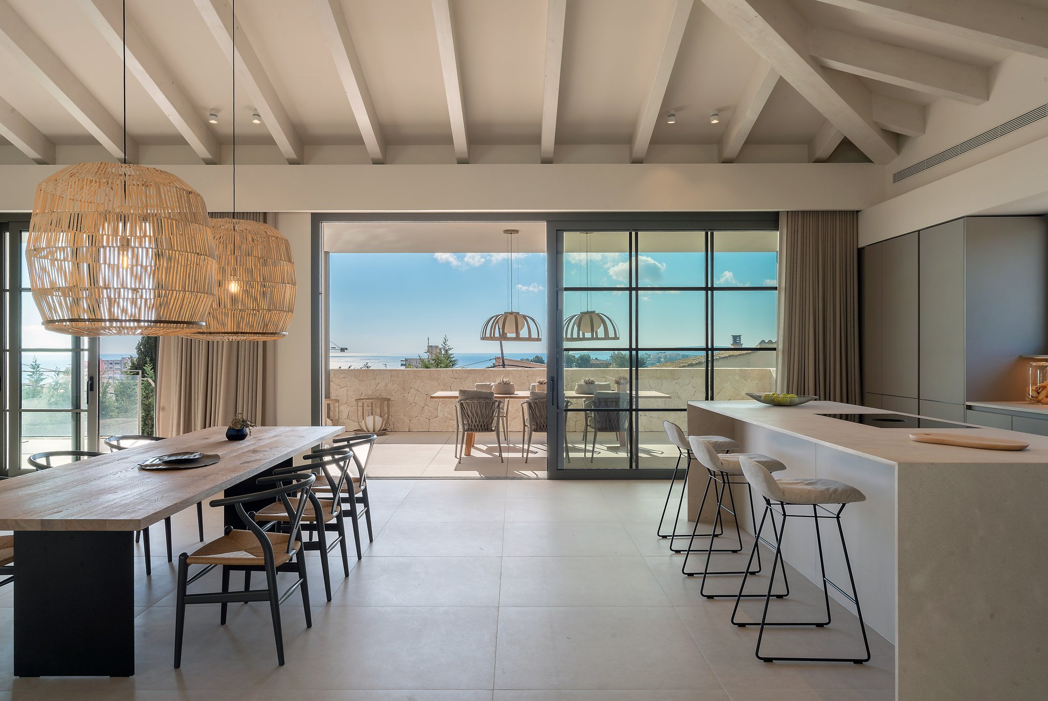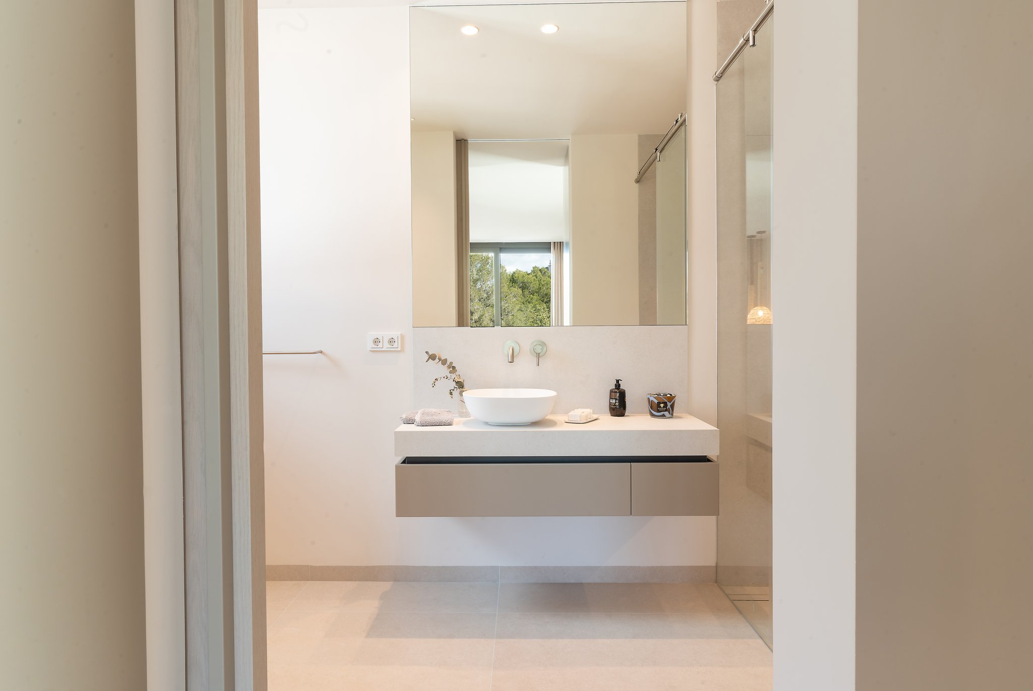 Eine schöne Treppe führt Sie auf die nächste Ebene, wo sich die große offene Küche und das Wohn-/Esszimmer mit Kamin und hohen Decken mit erstaunlichen Dachbalken befinden. Die Aussicht, die Sie hier willkommen heißt, ist absolut atemberaubend mit dem Pool mit Blick auf das Meer. Die großen, vom Boden bis zur Decke reichenden Fenster verleihen diesem geräumigen Zimmer einen wunderbaren natürlichen Lichteinfall und die Schiebetüren öffnen sich so, dass der Innenbereich eins mit dem Außenbereich wird. Der Salzwasserpool ist der perfekte Ort für die warmen Sommertage und es gibt auch einen Grill, um den Platz mit Freunden und Familie zu genießen. Die Terrasse und der Garten sind komplett mit hochwertigen Möbeln von Terraza Balear ausgestattet. Auf dieser Ebene finden wir das große Hauptschlafzimmer mit Badezimmer en-suite, das sowohl eine Dusche als auch eine große Badewanne umfasst, sowie ein weiteres Schlafzimmer und eine Gästetoilette. Dies ist ein Haus, das durch Qualität, Raum und nicht zuletzt durch seine atemberaubende Aussicht beeindrucken wird!