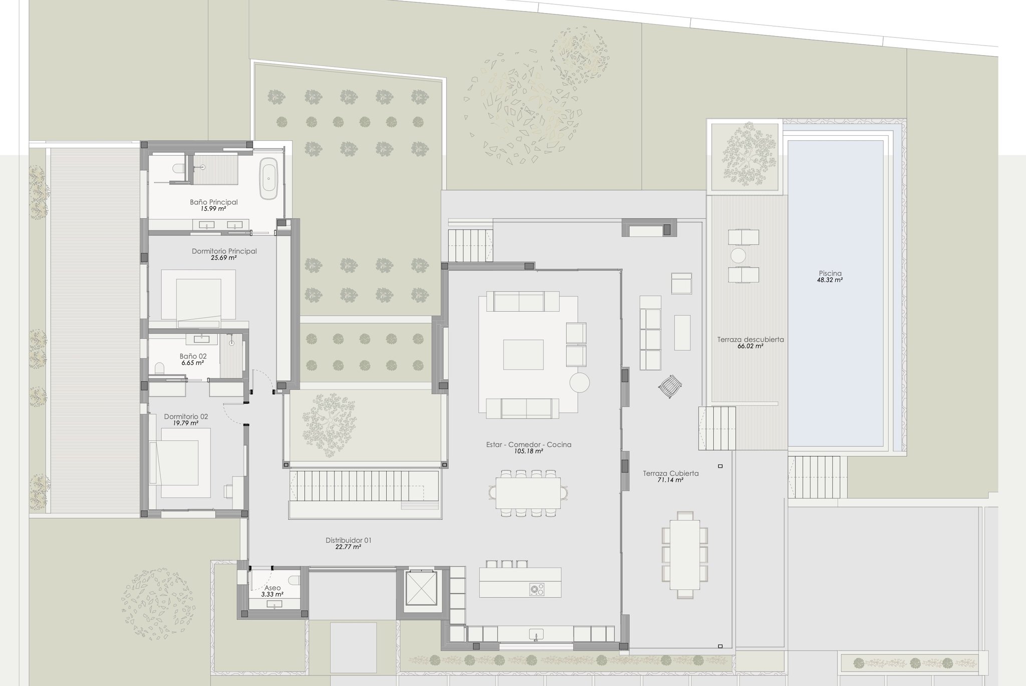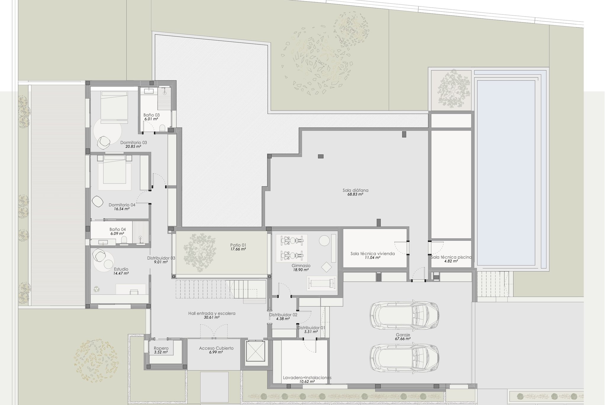 Das schöne und luxuriöse Haus wurde gerade fertiggestellt und bietet 413 m2 bebaute Fläche sowie 4 Schlafzimmer und 4 Badezimmer verteilt auf zwei Etagen. Die verwendeten Materialien und Geräte sind von High-End-Qualität wie Küche und Schränke von Birgit Müller, Fußbodenheizung und Salzwasserpool. Sie betreten das Anwesen in eine lichtdurchflutete Eingangshalle mit hohen Decken und Blick auf einen schönen Innenhof. Auf der Eingangsebene befinden sich zwei der Schlafzimmer, beide mit Bad en-suite und Zugang zu einer großen Terrasse und Garten sowie ein Raum, der als Büro oder Gästezimmer genutzt werden kann, ein Raum, der für ein privates Fitnessstudio vorgesehen ist, eine Waschküche und eine Garage mit Platz für zwei bis drei Autos.