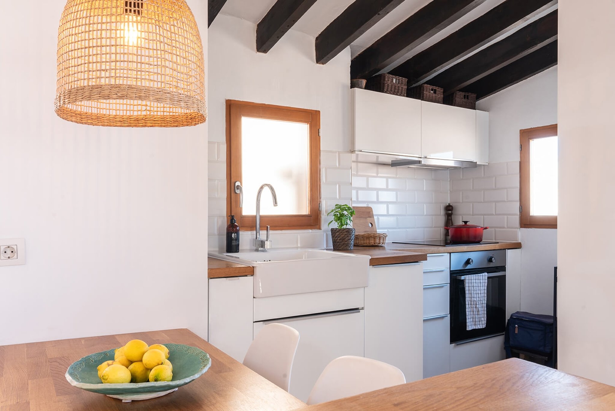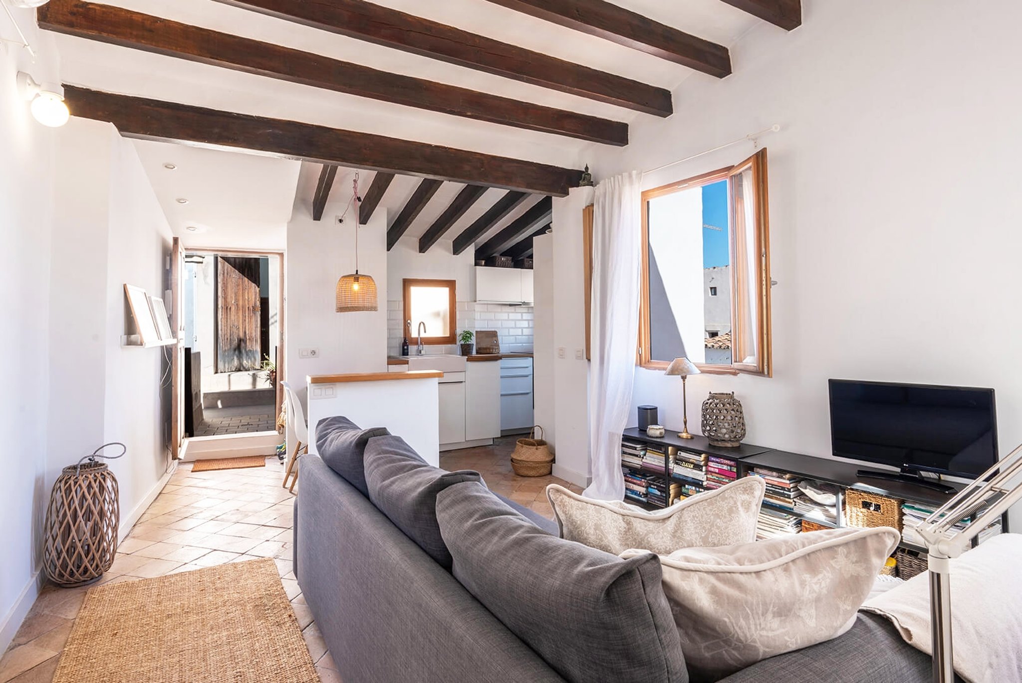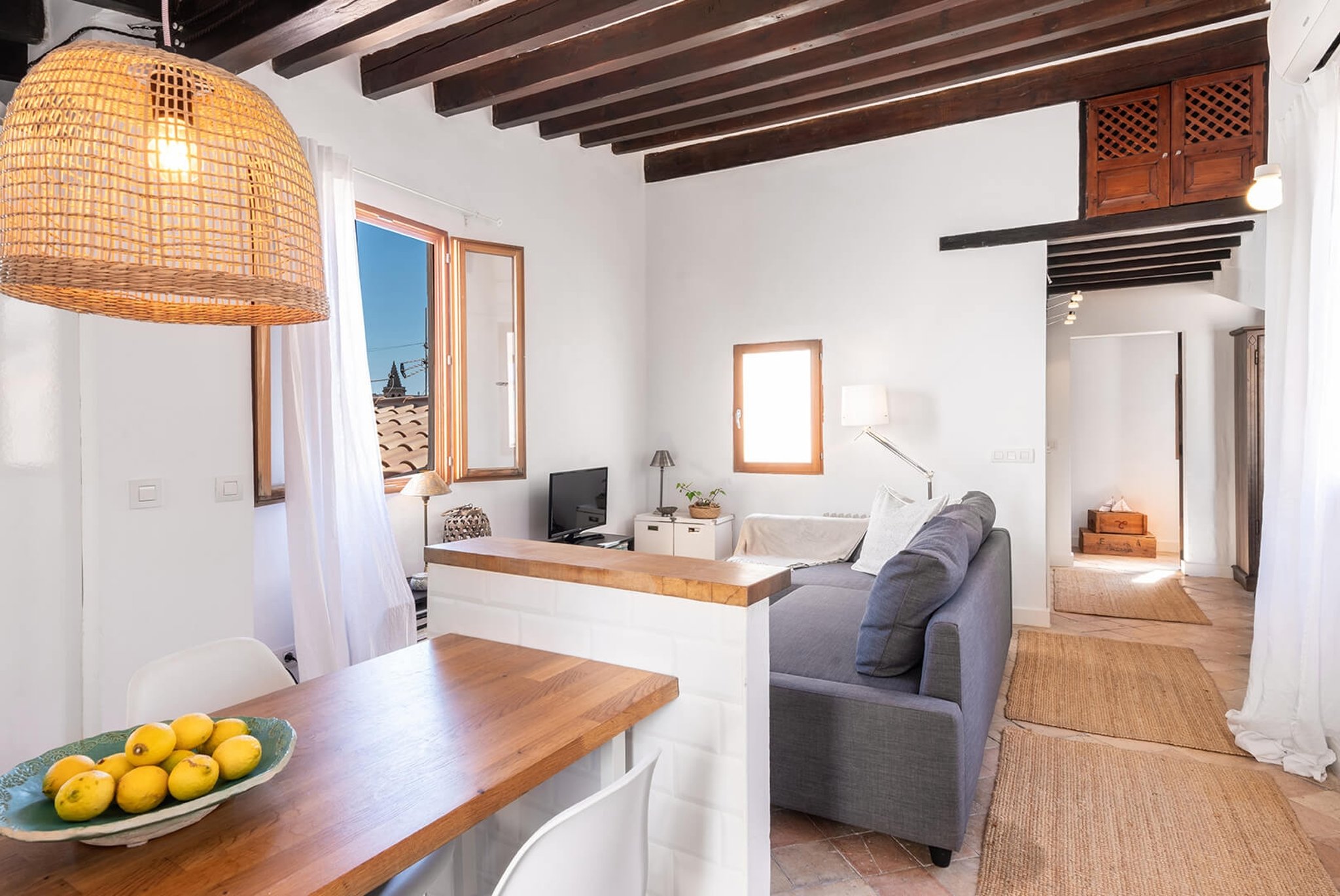 Dieses Penthouse mit einem Schlafzimmer befindet sich mitten in der Altstadt von Palma. Die Wohnung hat eine Wohnfläche von 42 m2 plus eine Terrasse von 20 m2. Sie besteht aus einem Wohnzimmer mit offener Küche, einem großen Badezimmer und einem Schlafzimmer. Die Wohnung besitzt viel Charm und wurde vor einigen Jahren renoviert. Das Wohnzimmer und das Schlafzimmer sind sehr hell, da die Wohnung viele Fenster hat. Am Eingang der Wohnung befindet sich eine große Terrasse, die den ganzen Tag Sonne hat.